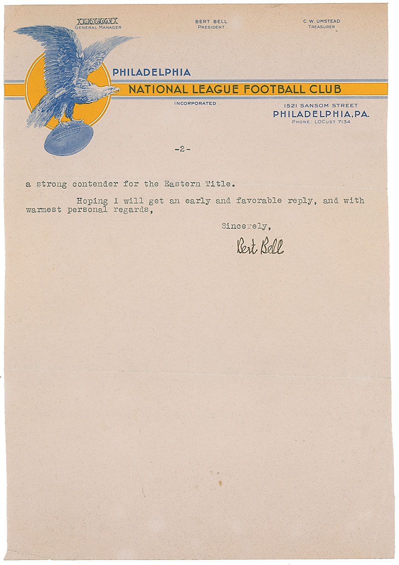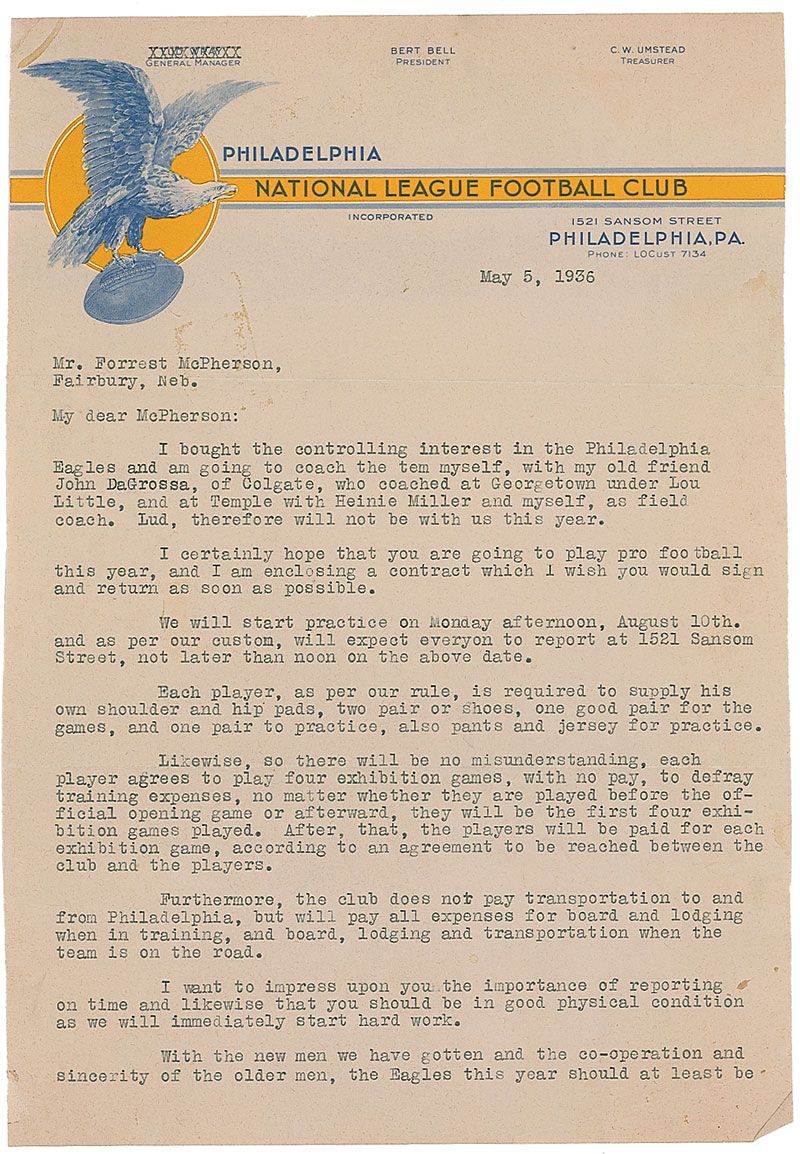 Football executive (1895–1959) who served as NFL commissioner from 1945 until his death. TLS, two pages, 7.5 x 10.75, Philadelphia National Football Club letterhead, May 5, 1936. Letter to lineman Forrest McPherson. In part: “I bought the controlling interest in the Philadelphia Eagles and am going to coach the team myself, with my old friend John DaGrossa…I certainly hope that you are planning to play pro football this year…We will start practice on Monday afternoon, August 10th…Each player, as per rule, is required to supply his own shoulder and hip pads, two pair of shoes, one good pair for the games, and one pair to practice, also pants and jersey for practice. Likewise, so there will be no misunderstanding, each player agrees to play four exhibition games, with no pay…Furthermore, the club does not pay transportation to and from Philadelphia, but will pay all expenses for board and lodging when in training, and board, lodging and transportation when the team is on the road.” Scattered toning and trimmed left and right edges, otherwise fine condition.