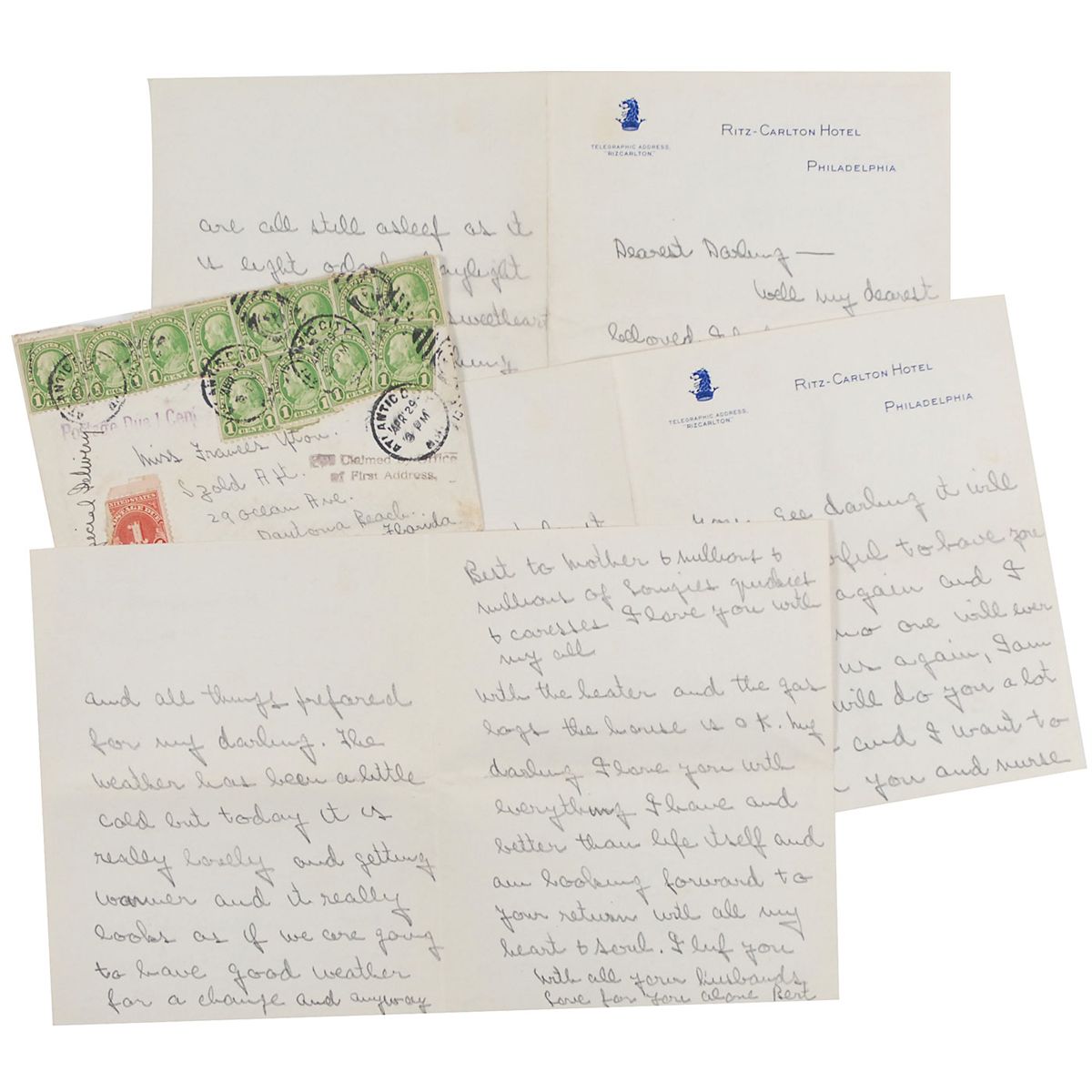 ALS in pencil signed “Bert,” 12 pages on three sets of adjoining sheets, 5.25 x 6.5, Ritz-Carlton Hotel letterhead, postmarked April 29, 1934. Letter to Frances Upton, his future wife. In part: “It is eight o’clock daylight saving time. Gee sweetheart just think if everything goes all right and it meets with your plans that time next week you will be in my arms and I will be the happiest person in the wide world Darling you have been so wonderful to me & I love you so I can hardly wait for the millions & millions of kisses hugs caresses and all the pretty things I have to tell my darling girl oh boy do I love you.” In fine condition. Accompanied by the original mailing envelope, addressed in Bell’s hand.
