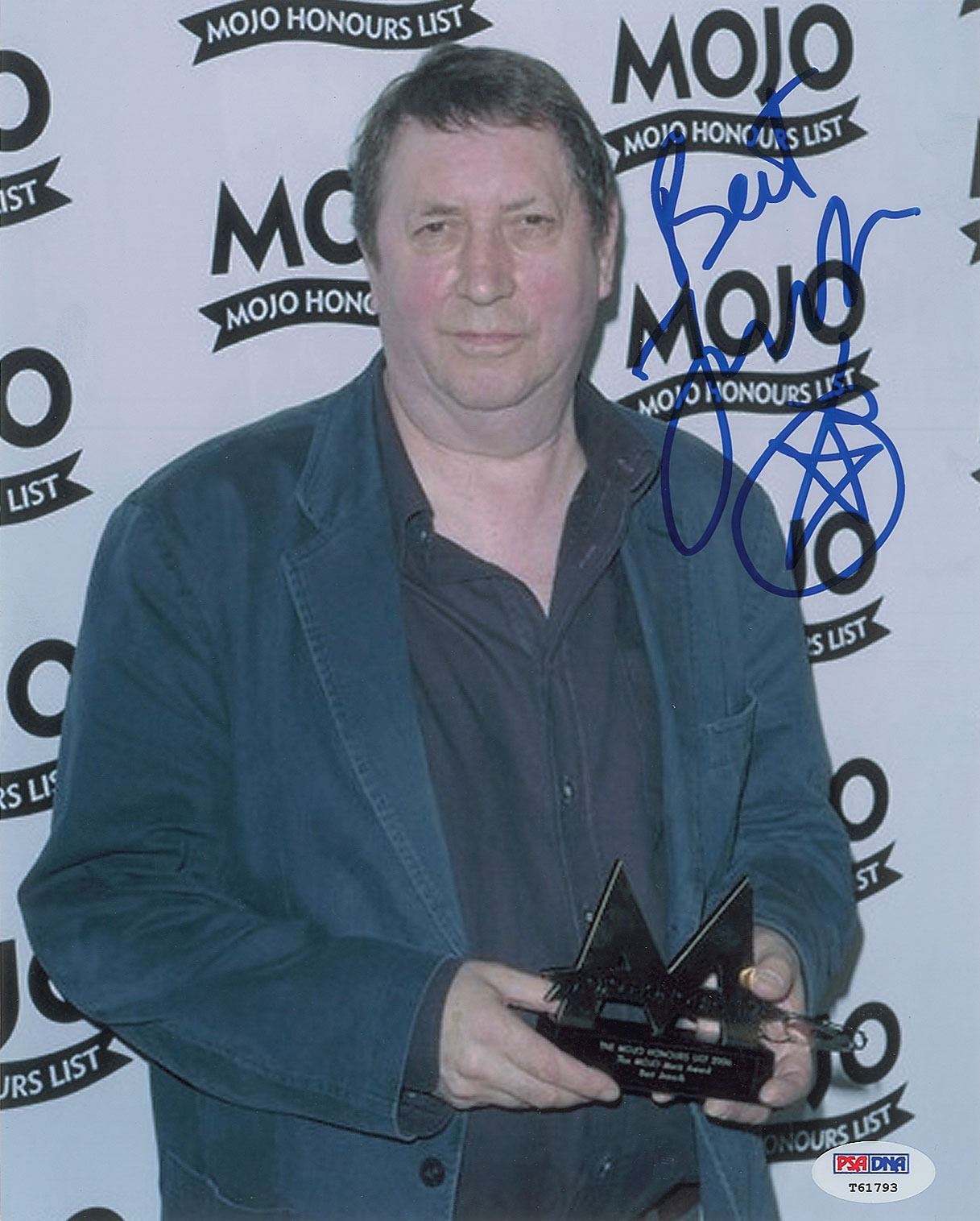 Scottish folk musician and founding member of the band Pentangle (1943–2011). Color glossy 8 x 10 photo of Jansch holding his MOJO Merit Award, signed in blue felt tip. In fine condition, with a PSA/DNA label affixed to the lower corner. Accompanied by a certificate of authenticity from PSA/DNA.