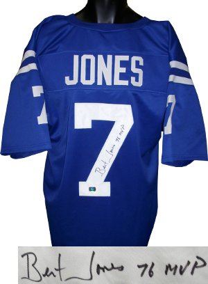 In 1973, Bert Jones was chosen in the first round (2nd overall) of the NFL draft by the Baltimore Colts. During his eight year tenure as the Colts' starting QB, Jones and his teammates enjoyed three consecutive AFC East division titles (1975–77). Jones was honored by the Associated Press as 1976's NFL Most Valuable Player and NFL Offensive Player of the Year, selected All-Pro and named to the Pro Bowl team. Jones was also selected 2nd Team All-Pro following the 1977 season. Bert Jones has hand signed this Baltimore Colts Blue Prostyle jersey with 76 MVP inscription. Certificate of Authenticity from Athlon Sports.
