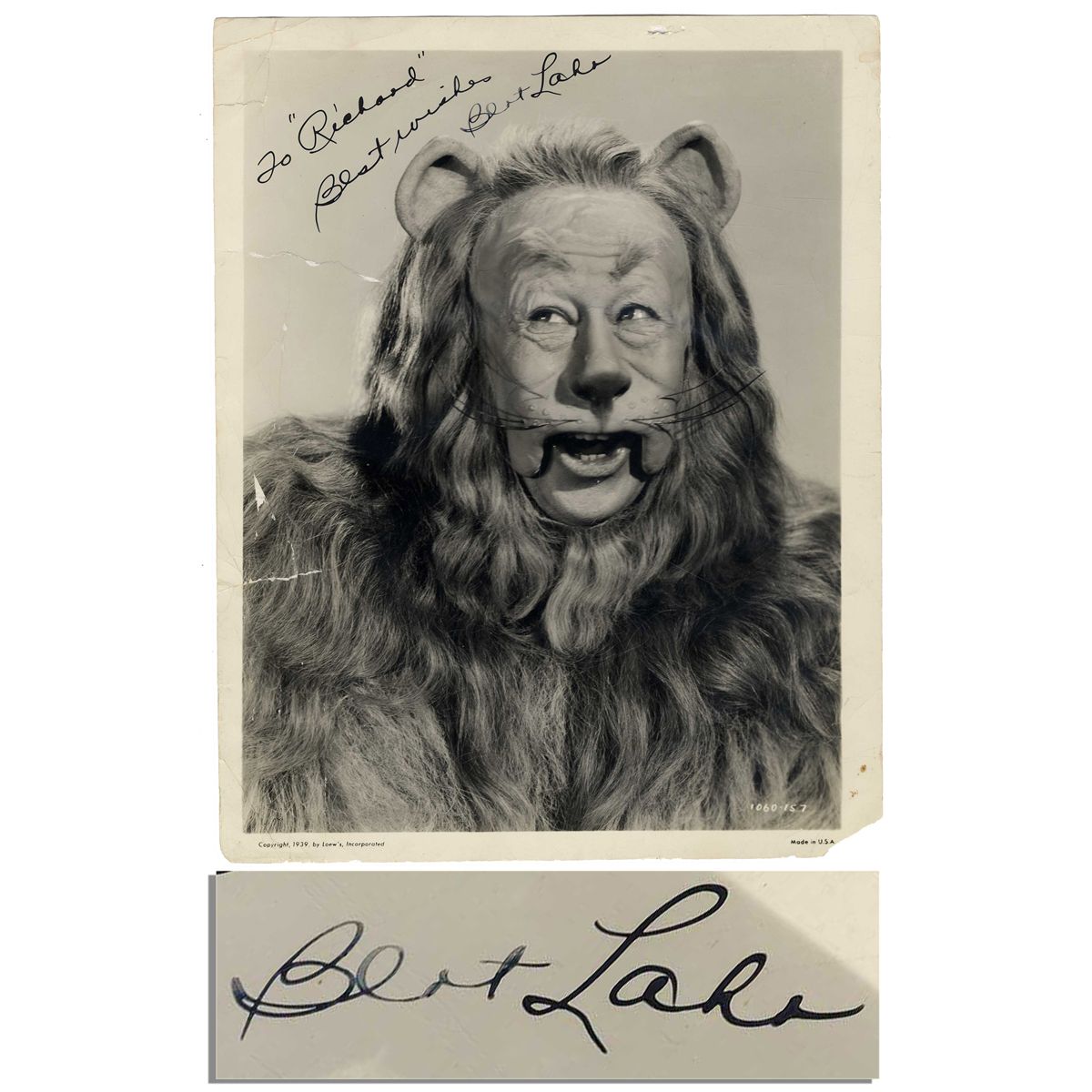 Scarce 8'' x 10'' signed photo of Bert Lahr as the beloved ''Cowardly Lion'' in the 1939 film version of the ''The Wizard of Oz.'' Signed ''To 'Richard' / Best Wishes / Bert Lahr''. Some creasing remains after tears along left edge were professionally repaired, not affecting signature. Overall very good condition. Accompanied by PSA/DNA COA. Lahr hardly ever signed photos of himself in his most iconic role, thus authentic signed photos in full Lion regalia are exceedingly scarce.