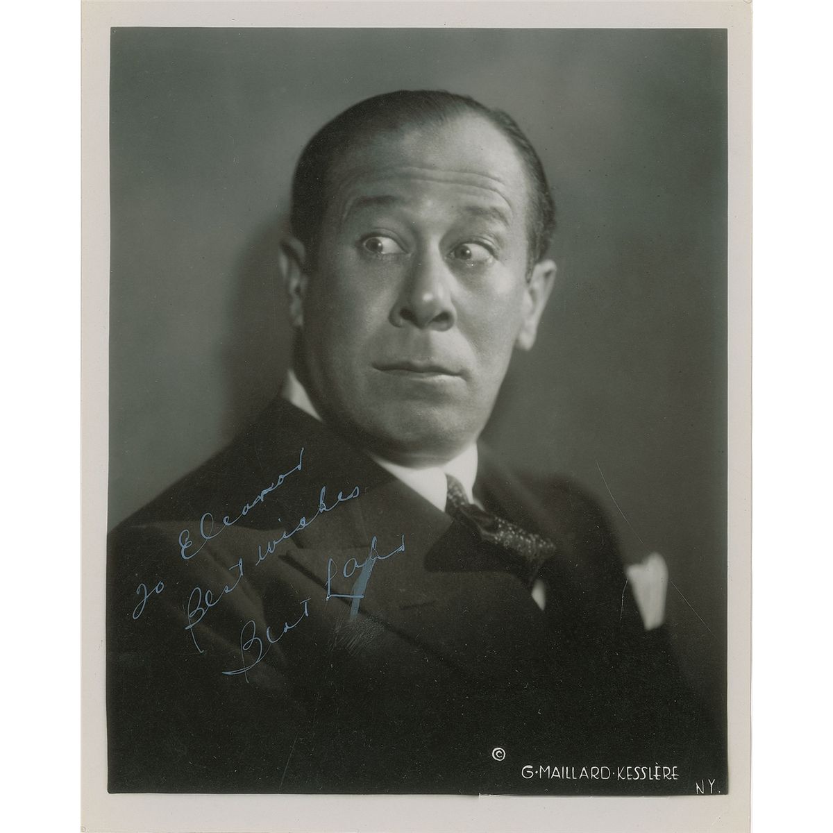 Vintage pearl-finish 8 x 10 double-weight photo of Lahr dressed in a sharp-looking suit and tie, signed and inscribed in white ink, “To Eleanor, Best wishes, Bert Lahr.” In fine condition, with a small brush to a single letter of last name of signature, and a couple trivial creases to lower right corner tip.