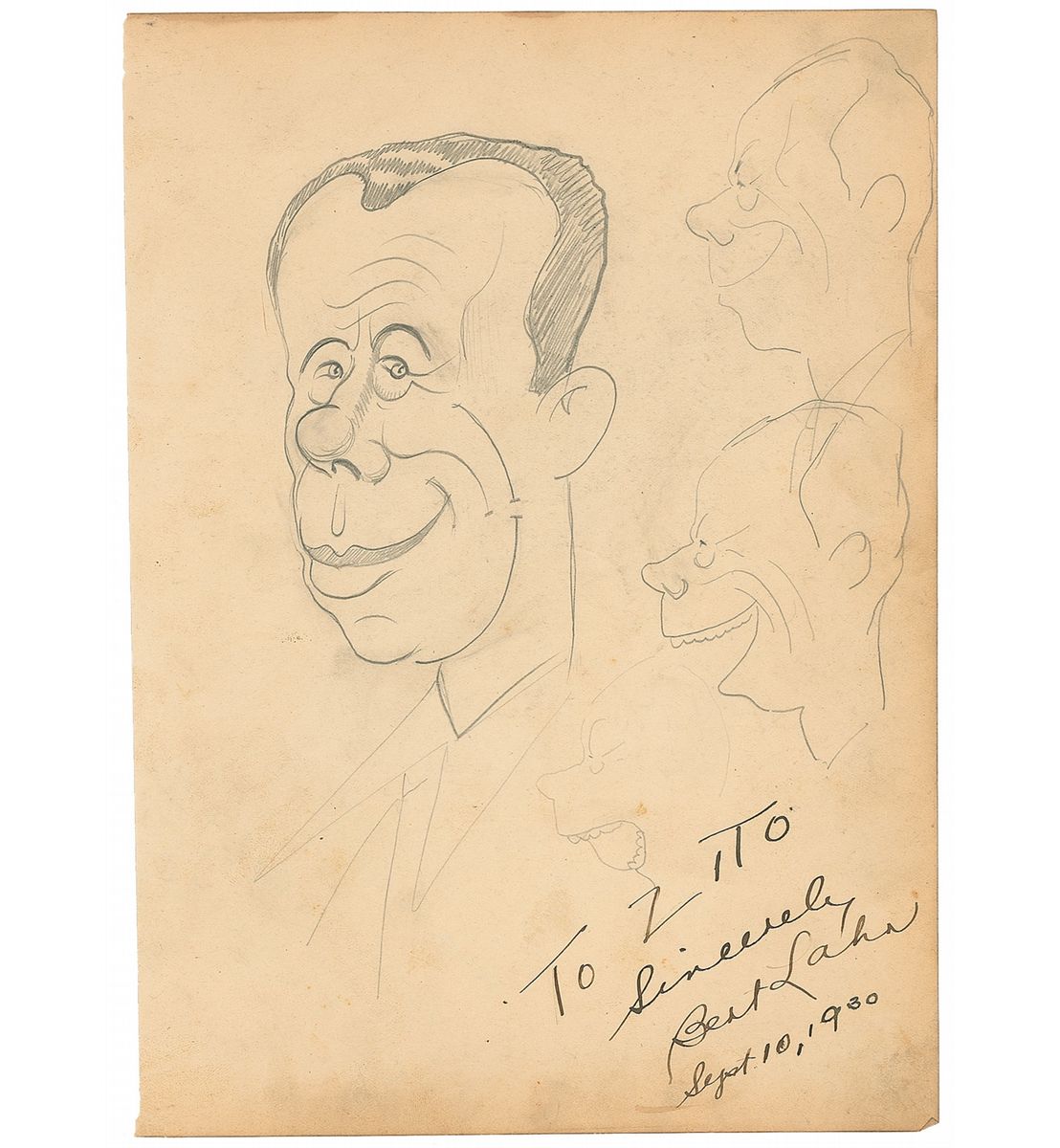 Four original vintage signed pencil sketches of Lahr’s face, done by famed international artist Vincenzo Maria Zito, on an off-white 7.25 x 10 sketch book page, signed and inscribed in fountain pen, “To Zito, Sincerely, Bert Lahr, Sept 10, 1930.” Scattered light toning and soiling, otherwise fine condition. Accompanied by a letter of authenticity from James Spence.