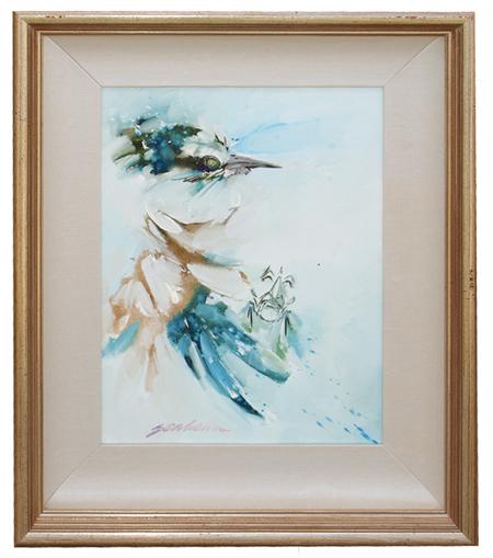 Signed original acrylic on canvas depicting a woodpecker and a hidden face "Kingfisher Medicine". 18" x 14" (26" x 22")