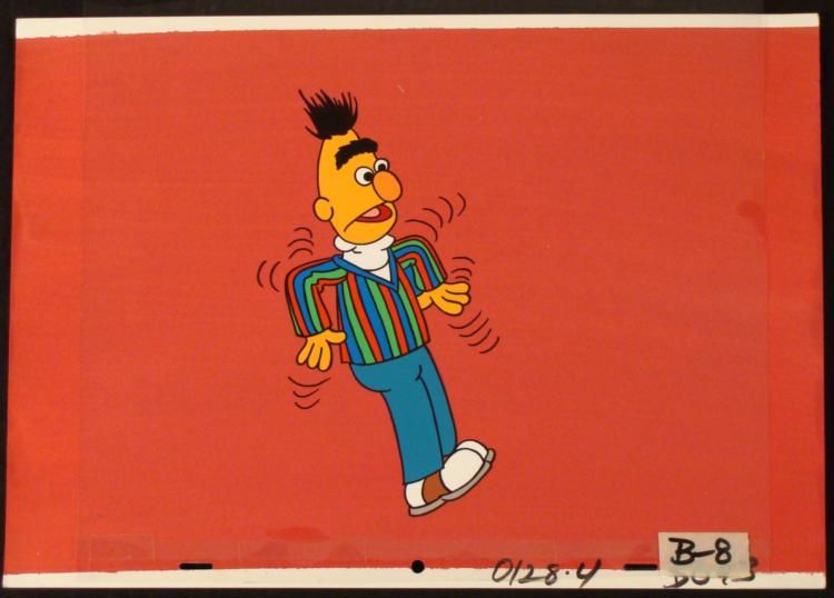 Bert is wondering where Ernie is. * * * Original Animation Cel & Production Background * * Medium: Hand painted acetate celDetails: Animation notations and peg holes * * Size of cel: 10 1/2 x 12 1/2 inchesSize of background: 10 1/2 x 14 3/4 inchesCondition: Very good * * * This is an original hand-painted cel set-up used in the production of an episode of "Sesame Street." Each one-of-a-kind set-up represents a slight change in position of the characters. When individually photographed and projected in rapid succession, the images * appear to move. * * To create production cels, the original animator's drawing is transferred onto an acetate cel (by hand-inking and/or photo copying). The cel is then hand-painted on the reverse side. The background accompanying this set-up is an original hand-painted background.
