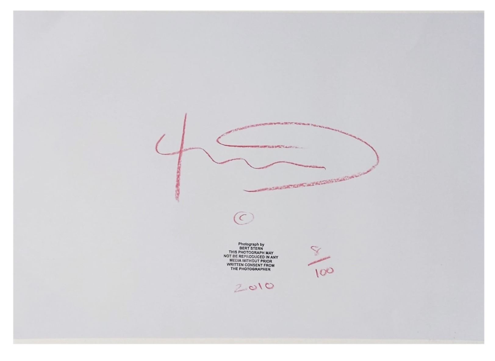 Signed in red crayon on front and back by Bert Stern. And provided with Bert's handwritten coa.