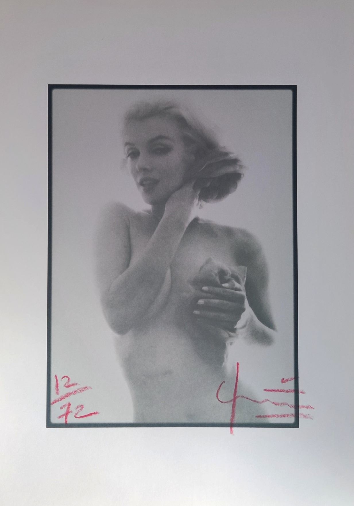 Marilyn Monroe from the last sittings photo shoot from June 1962 at the Hotel Bel Air (Later print). Seductive in this pose. In an edition of 72. Signed by photographer Bert Stern on the front and the verso. Copyright stamped. And Supplied with Bert Stern's coa.