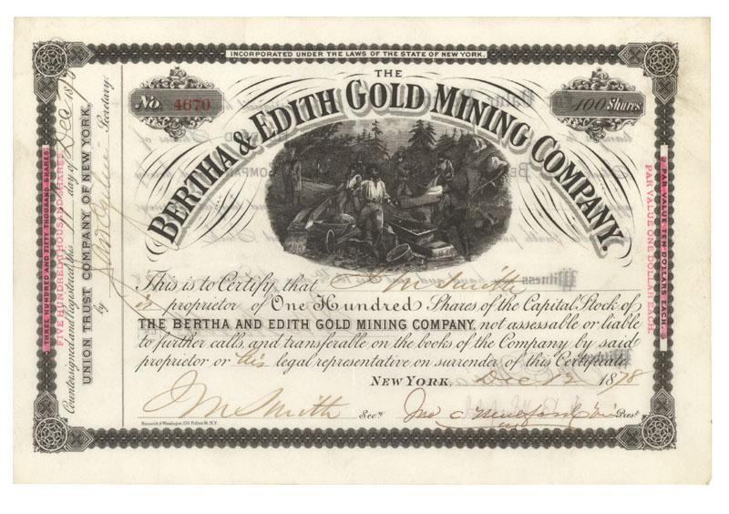 1878, New York. Stock certificate for 100 shares. Black. Vignette at top center of gold miners.