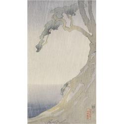Bertha Lum woodblock print, “Rain”, signed, 6.25”w x 10.75”h, matted and framed, excellent condition
