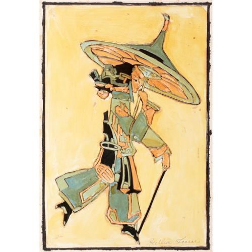 Bertha Lum woodblock, colorful raised line print of a woman with parasol, signed, unframed, 11" x 16"