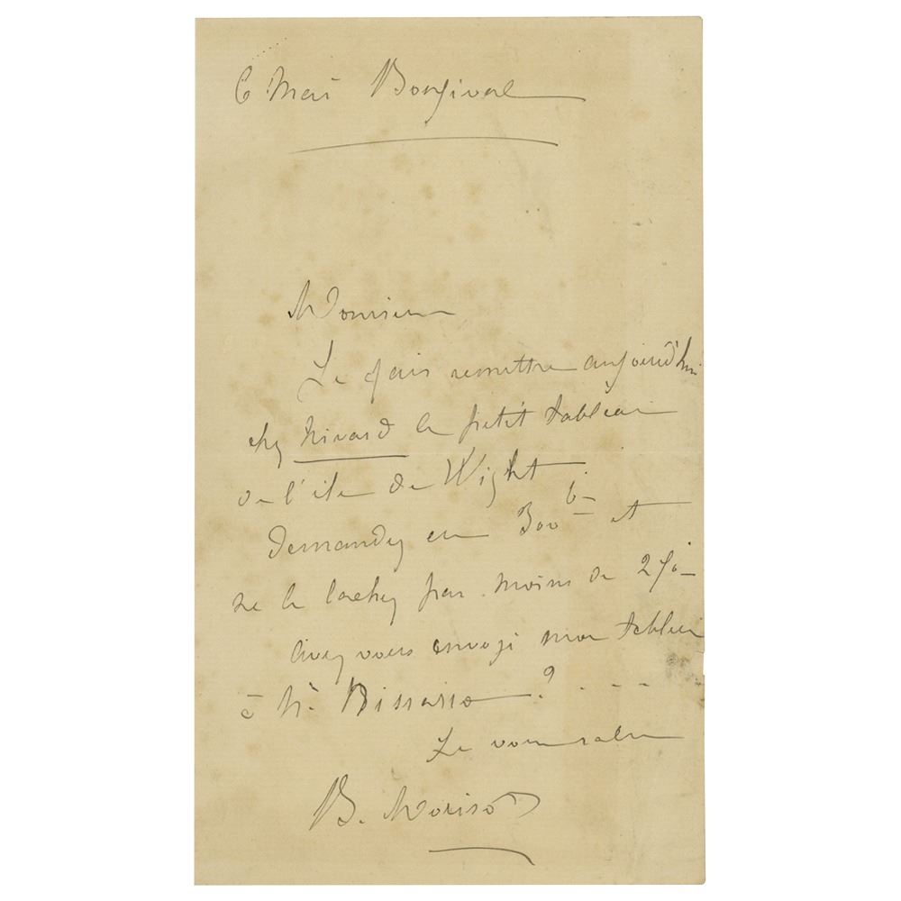 French painter (1841–1895) considered one of the greatest female Impressionists alongside Mary Cassatt. She was married to Eugene Manet, the brother of her friend and colleague Edouard Manet. ALS in French, signed “B. Morisot,” one page, 4 x 7, May 6. Untranslated handwritten letter by Morisot, mentioning Pissarro in the last line. In very good to fine condition, with faint toning and foxing.