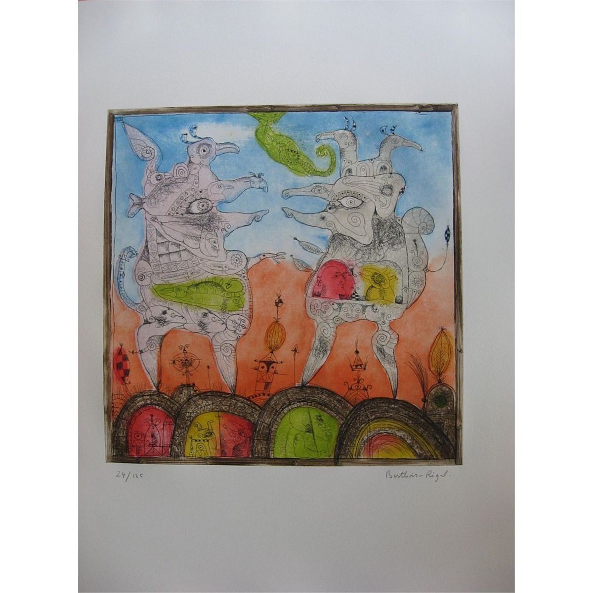 Bernard Berthois-Rigal was born in 1927 in Paris. His style can be described as a cross between surrealism and fantastic realism. His creations are amalgams of found objects and rich pigments which conjure up a make-believe world of Byzantine elegance. Berthois-Rigal began painting at the age of 28, in 1955, without any formal training. He abandoned his artistic career in 1960. Some 12 years later, he resumed painting after one of his paintings was honored and chosen by UNICEF for a greeting card. The following year he held his first exhibition, in Rome. Berthois-Rigal employs a remarkable technique that he has developed in is work using tissue paper, watercolors, gouache, India ink, and in his own terms, "recovery of waste materials."Partial List of Exhibitions and Museums: Ingres Museum, MontaubanrnMuseum of Modern Art, City of Parisrn Alphonse Chave Gallery, VencernLe Scribe Gallery, MontaubanrnGalerie Francaise, Saavebruck and Munich, West Germany Group Exhibition, "Arts en Yvelines" at the Orangerie, Chateau de Versailles Graphica Gallery, Tokyo Japan The Seine Gallery, Paris Society I.M.P. of Brussels Salon de Mai, Cardin Room, ParisrnSalon de Mai, Brand Palais, ParisrnStrafor Foundation, The Municipal Gallery, Nancy, Francern Galerie Protee, Paris, Nahan Galleries, New Orleans, New York.