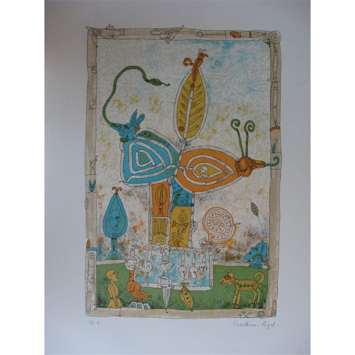 Bernard Berthois-Rigal was born in 1927 in Paris. His style can be described as a cross between surrealism and fantastic realism. His creations are amalgams of found objects and rich pigments which conjure up a make-believe world of Byzantine elegance. Berthois-Rigal began painting at the age of 28, in 1955, without any formal training. He abandoned his artistic career in 1960. Some 12 years later, he resumed painting after one of his paintings was honored and chosen by UNICEF for a greeting card. The following year he held his first exhibition, in Rome. Berthois-Rigal employs a remarkable technique that he has developed in is work using tissue paper, watercolors, gouache, India ink, and in his own terms, "recovery of waste materials."Partial List of Exhibitions and Museums: Ingres Museum, MontaubanrnMuseum of Modern Art, City of Parisrn Alphonse Chave Gallery, VencernLe Scribe Gallery, MontaubanrnGalerie Francaise, Saavebruck and Munich, West Germany Group Exhibition, "Arts en Yvelines" at the Orangerie, Chateau de Versailles Graphica Gallery, Tokyo Japan The Seine Gallery, Paris Society I.M.P. of Brussels Salon de Mai, Cardin Room, ParisrnSalon de Mai, Brand Palais, ParisrnStrafor Foundation, The Municipal Gallery, Nancy, Francern Galerie Protee, Paris, Nahan Galleries, New Orleans, New York.
