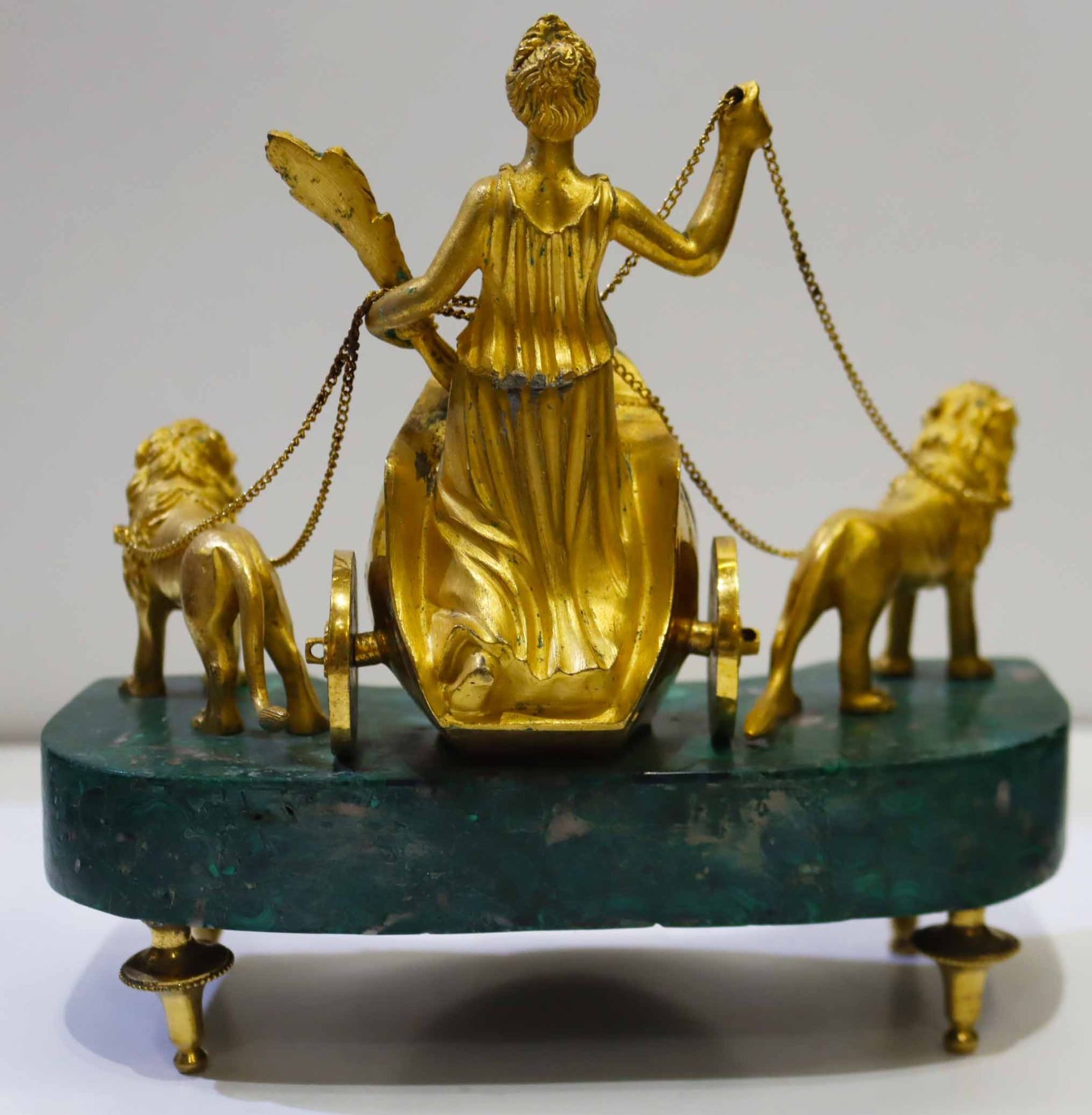 Signed porcelain dial with free chain fusee movement. Triumph holding two lions on malachite base.