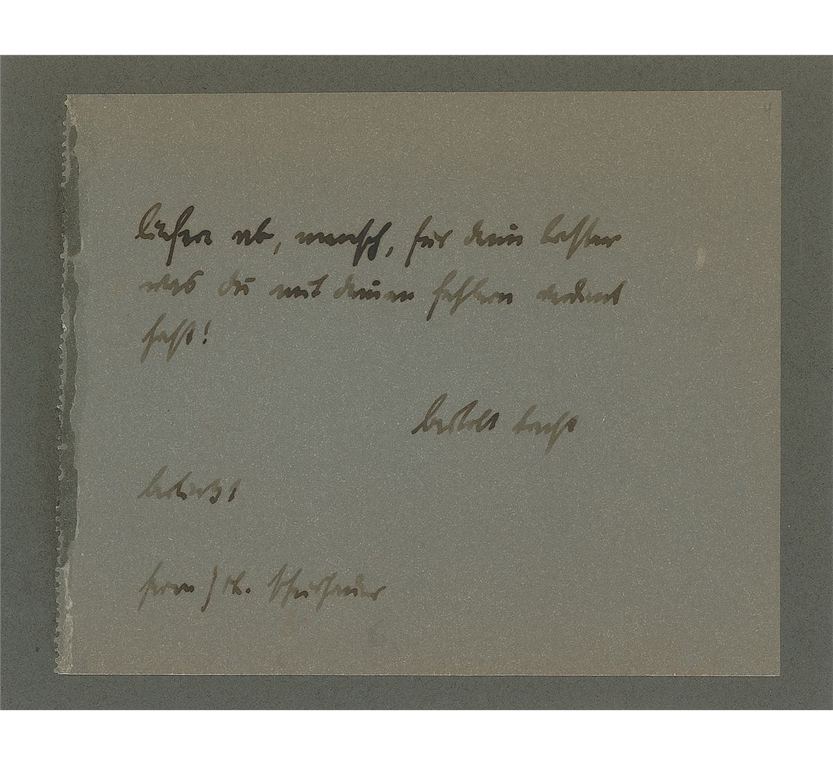 German playwright, poet, and theatre director (1898–1956). Uncommon AQS in German on a thin off-white 5 x 4.25 onionskin sheet, signed below and dated Berlin 1931. In full (translated): “Deliver, human being, the best, what you have deserved from your mistakes.” Mounted at the left edge to a slightly larger card. In fine condition, with overall toning.