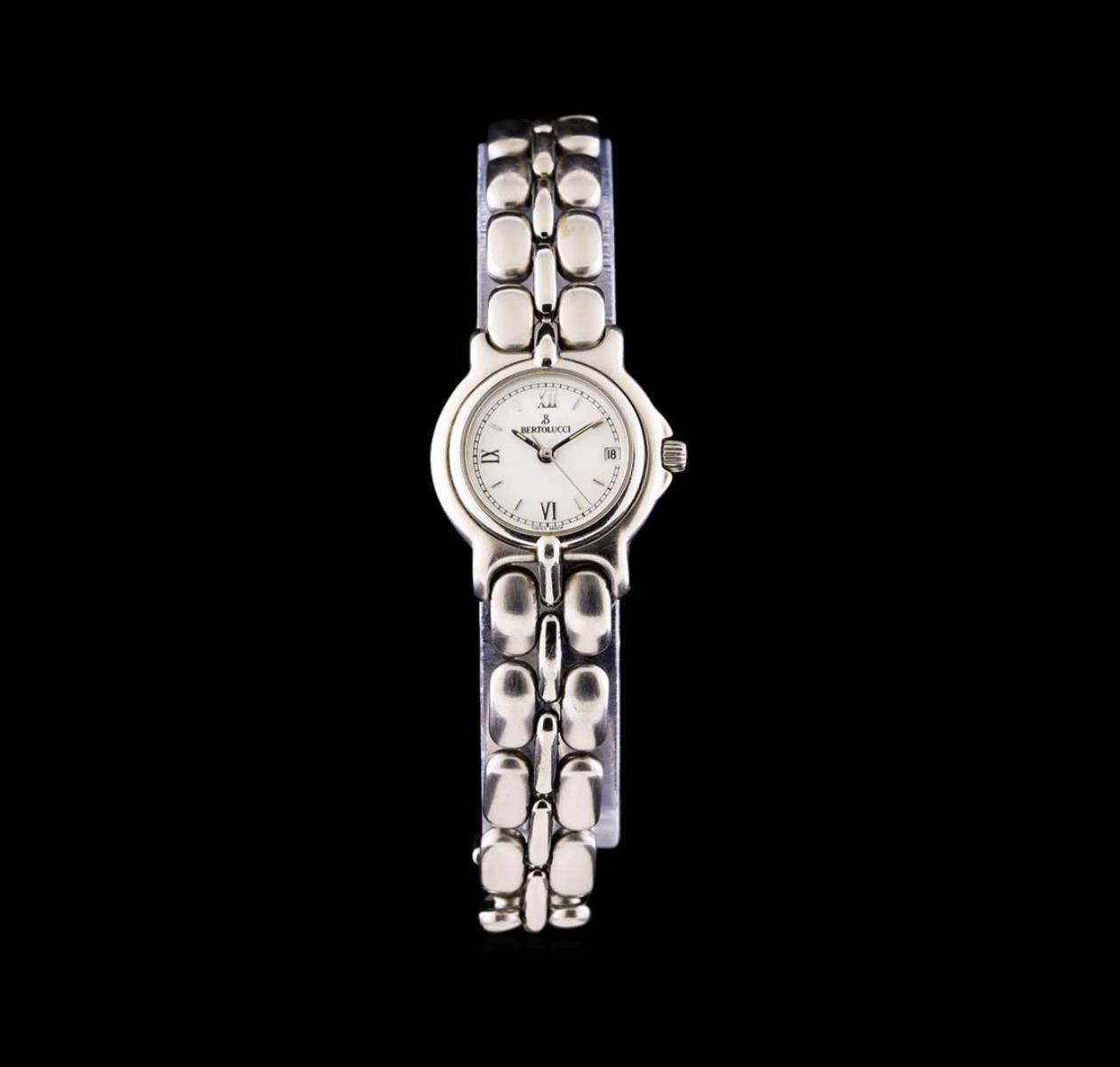 One Bertolucci Pulchra ladies watch featuring: Case: Stainless steel. Bezel: Stainless steel. Dial: White color; luminous silver-tone hour and minute hands; silver-tone hour markers. Date window located at the 3 o'clock position. Bracelet: Stainless steel. Condition: Barely noticeable surface scratches on bracelet and clasp, but otherwise there are no major signs of wear.