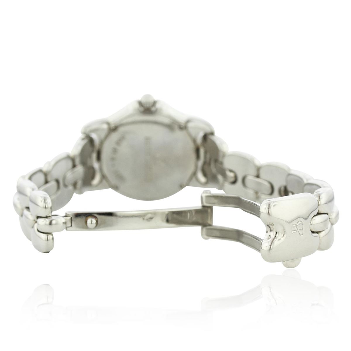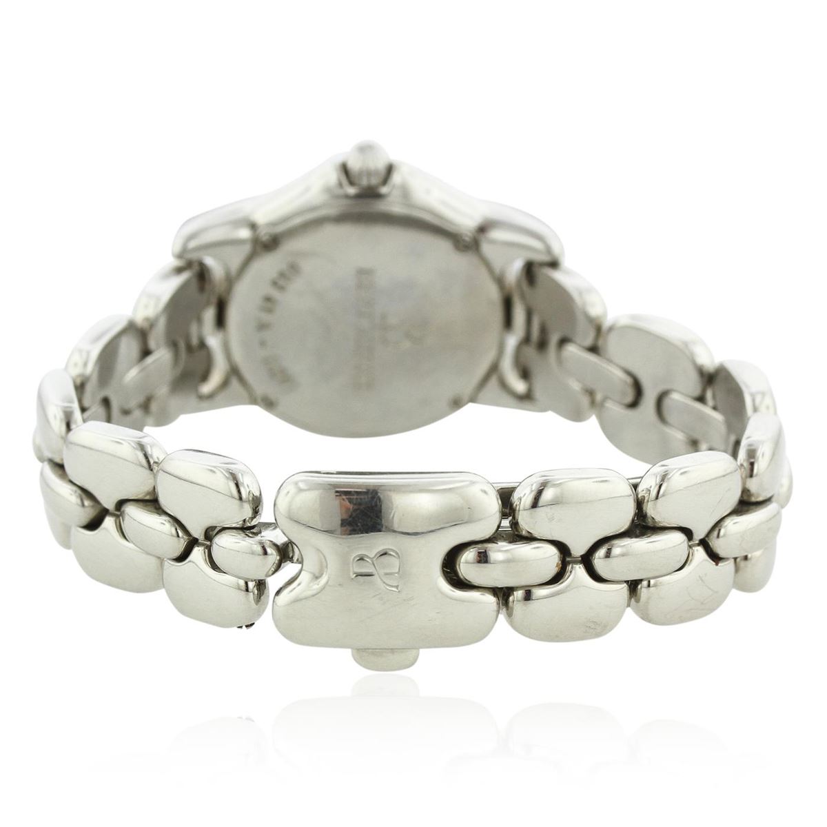 One ladies Bertolucci Pulchra Mini Vir Wristwatch featuring: Factory Diamond Bezel, Stainless Steel Crown, Lugs, and 24mm Case, Diamond Hour Markers, Date at 3 o'clock position, Steel Hour, Minute, and Second Hands, Deployment Clasp, 083 41 A -- 11201, Mother of Pearl Dial, Precision Swiss Quartz Movement.