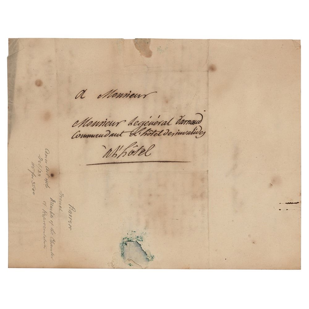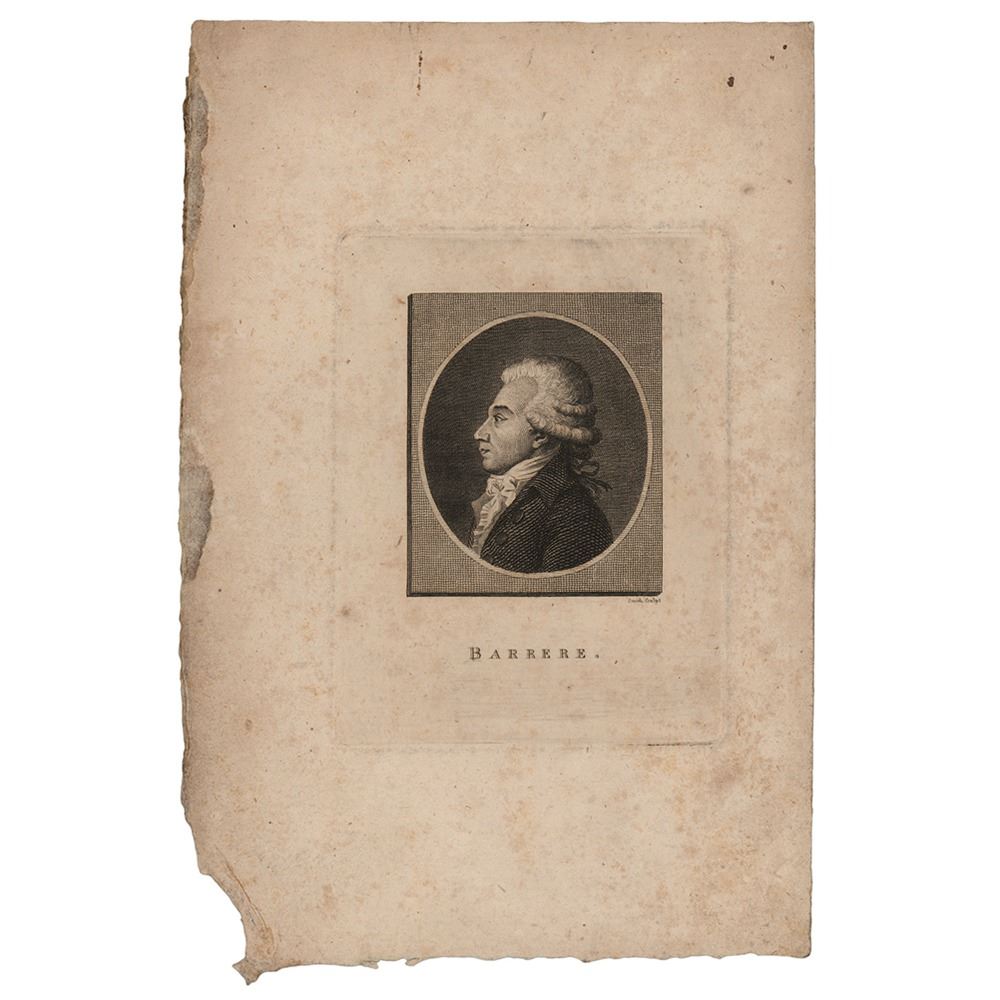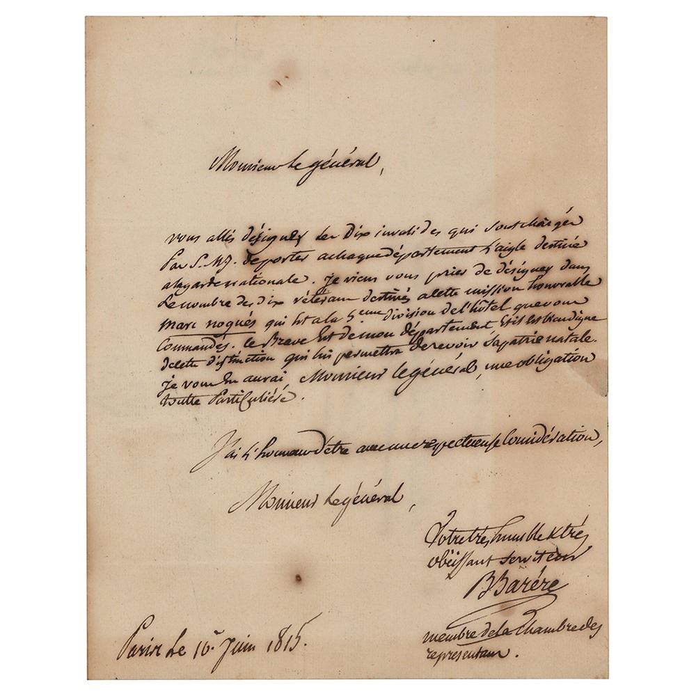 ALS in French, signed “B. Barere, membre de la chambre des représentants,†one page, 7 x 9, June 16, 1815. Untranslated handwritten letter to Jacques Leroy de Saint-Arnaud, "General d'Arnaud, Commandant L'Hotel des Invalides." Addressed on the integral leaf in Barere's hand. In very good to fine condition, with a few minor stains and seal-related loss to the address leaf. Accompanied by an engraved portrait.