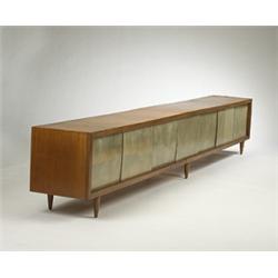 Bertrand Goldberg storage cabinet for the Helstein House, Chicago USA, 1950 mahogany, fiberglass, steel 180"w x 19"d x 23.5"h Cabinet featuring seven sliding fiberglass doors concealing four drawers and three storage compartments set on six tapered legs. Provenance: Rachel and Ralph Helstein, Chicago