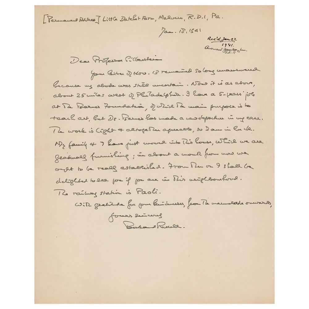 ALS, one page, 8.5 x 11, January 18, 1941. Handwritten letter to Dr. Ludwik Silberstein, in part: "Your letter of Nov. 13 remained so long unanswered because my abode was still uncertain. Now it is as above, about 25 miles west of Philadelphia. I have a 5-years' job at The Barnes Foundation, of which the main purpose is to teach art, but Dr. Barnes has made a new department in my case. The work is light & altogether agreeable, so I am in luck. My family & I have just moved into this house, which we are gradually furnishing; in about a month from now we ought to be really established. From then on I shall be delighted to see you if you are in this neighbourhood. The railways station is Paoli." Silberstein notes the dates of receipt and reply in the upper right. In fine condition.