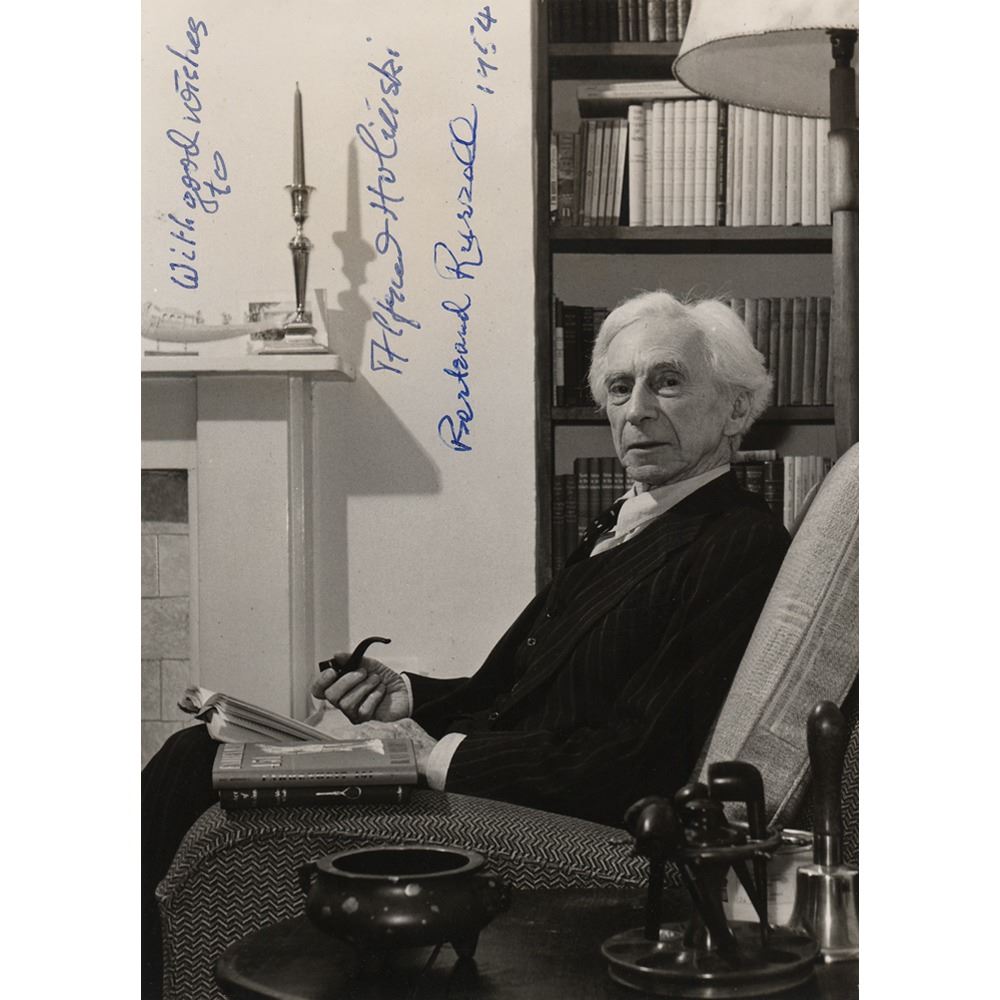 Vintage matte-finish 5 x 6.75 photo of the great intellectual in his study, signed and inscribed in blue ballpoint, "With good wishes to Alfred Holienski, Bertrand Russell, 1954.” In fine condition, with faint silvering and creasing.