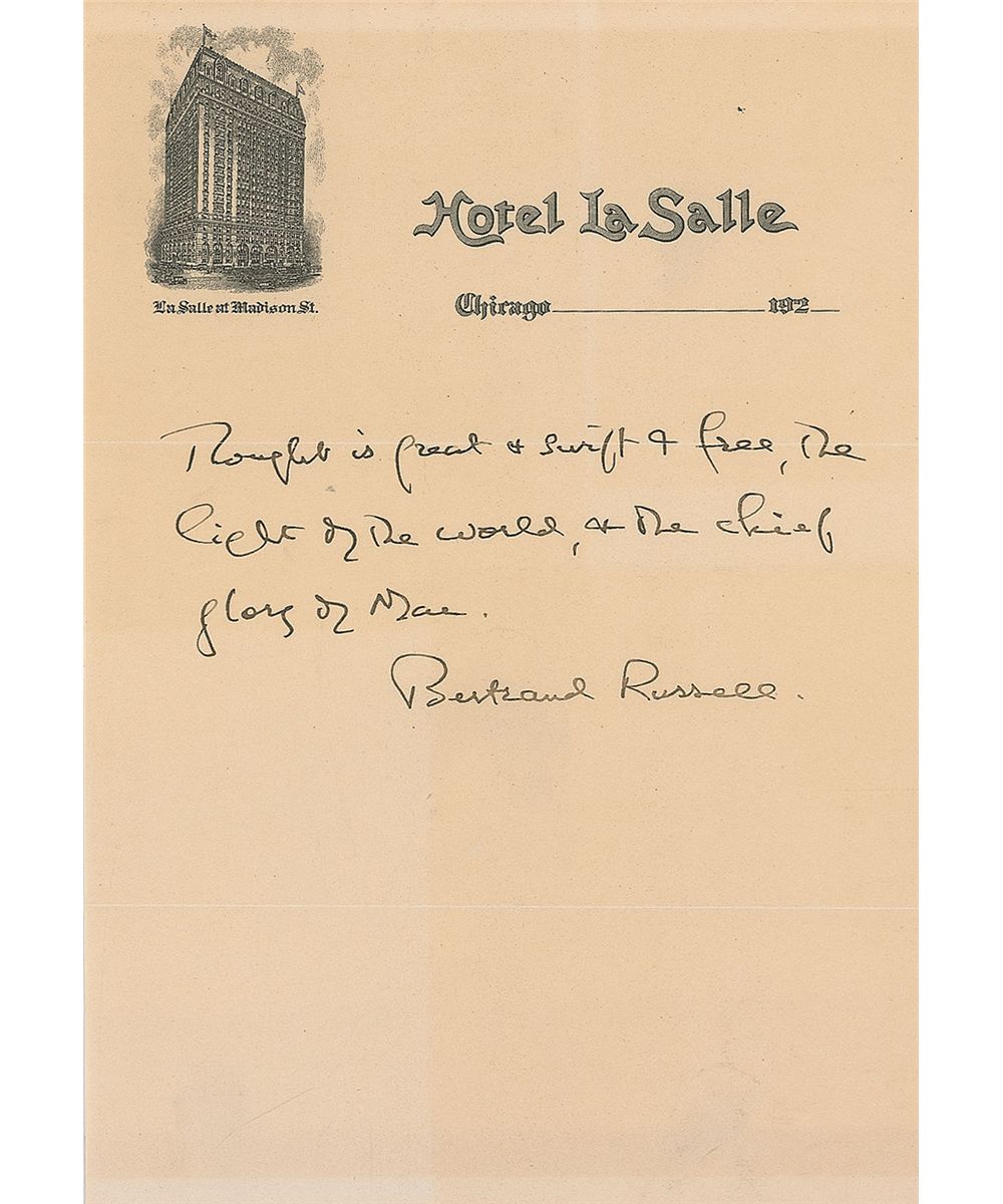 British writer, philosopher, and mathematician (1872–1970) who won the Nobel Prize for Literature in 1950. AQS on a 5.5 x 8 sheet of Hotel La Salle, Chicago, stationery. Russell writes, in full: “Thought is great & swift & free, the light of the world, & the chief glory of man.” Signed at the conclusion, “Bertrand Russell.” In fine condition, with a uniform shade of mild toning. A very rare and desirable format of one of Russell’s more famous passages, the first one we have ever offered.