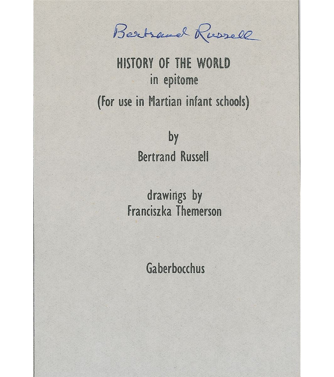 Booklet entitled ‘History of the World in Epitome,’ ten pages, 3.25 x 4.75, published by the Gaberbocchus Press on May 18, 1962, signed on the title page in blue ballpoint. In fine condition, with a couple trivial creases.