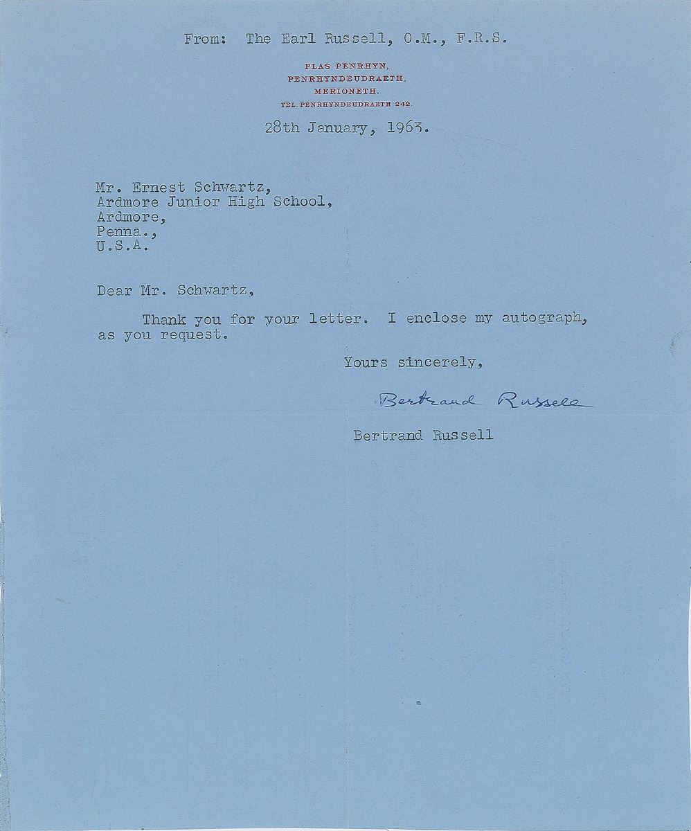 TLS, one page, 7.75 x 9.5, Plas Penrhyn, Penrhyndeudraeth, Merioneth letterhead, January 28, 1963. Letter to Ernest Schwartz, in full: “Thank you for your letter. I enclose my autograph, as you request.” In fine condition.