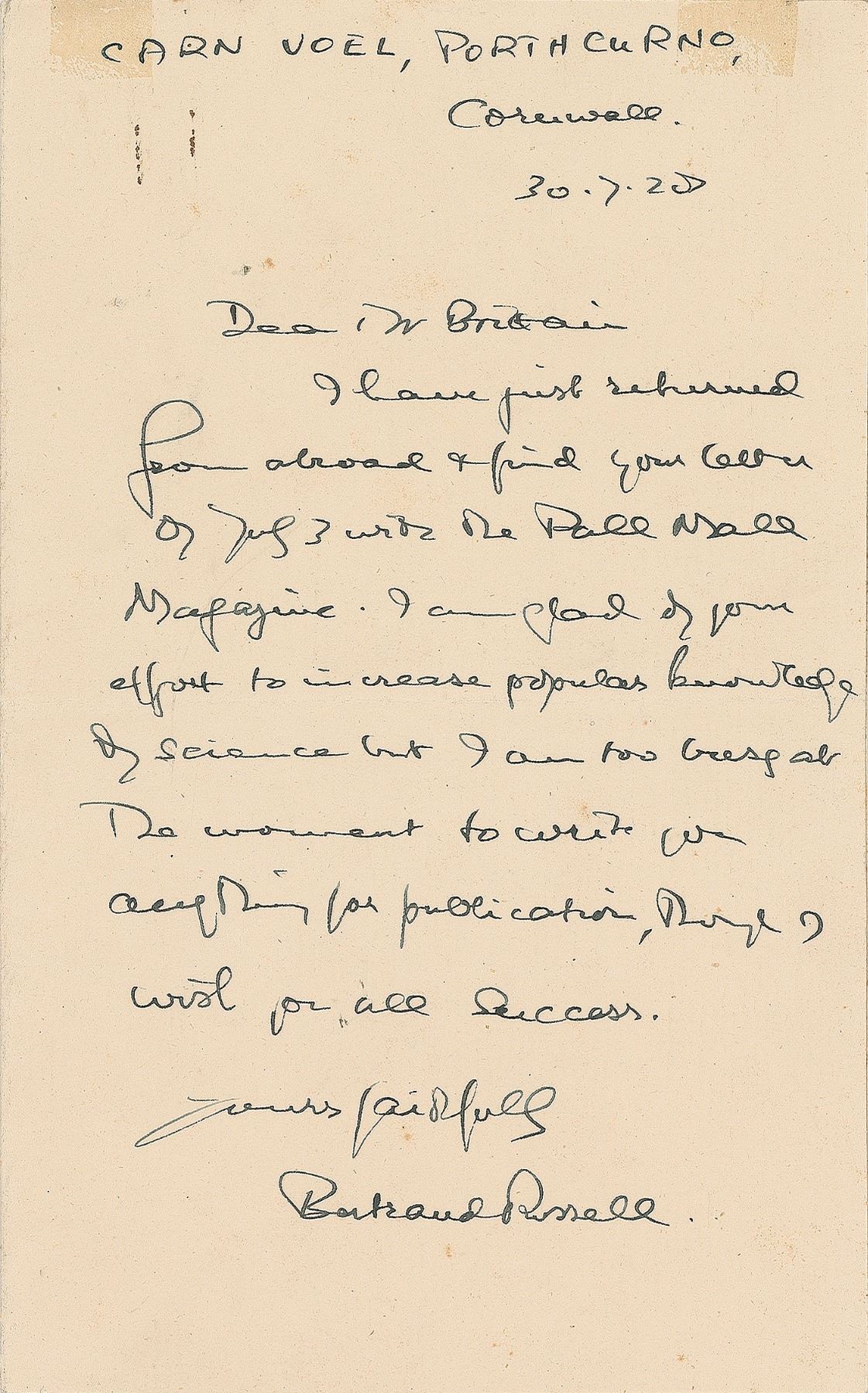 ALS, 4.5 x 7, July 30, 1929. In full: "I have just returned from abroad & find your letter of July 3 with the Pall Mall Magazine. I am glad of your effort to increase popular knowledge of science but I am too busy at the moment to write you anything for publication, though I wish you all success." In fine condition, with two small pieces of tape, and a rusty paperclip impression, to the top edge.