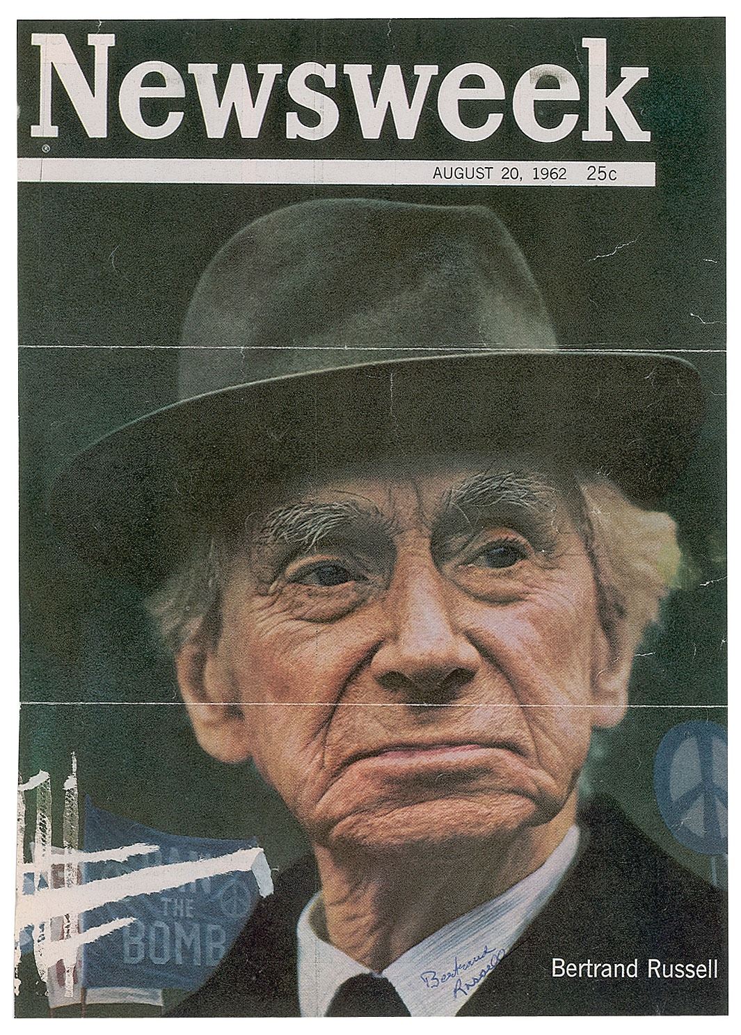 Cover of Newsweek magazine from August 20, 1962, showing Bertrand Russell in front of a 'peace' sign and a 'Ban the Bomb' banner, signed on his collar in ballpoint. In very good condition, with trimmed edges, two horizontal mailing folds, and surface loss from a removed address label.
