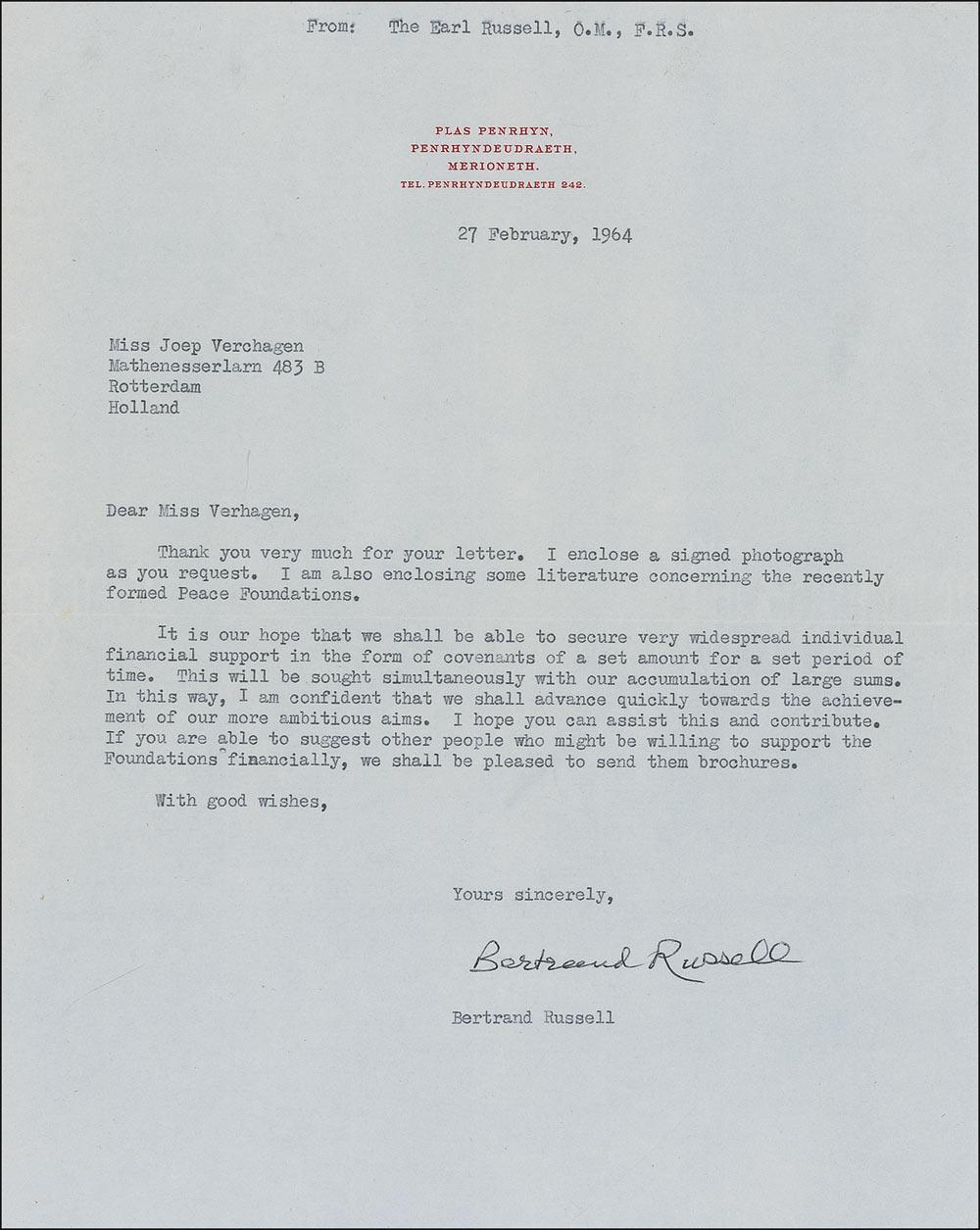 British writer, philosopher, and mathematician (1872–1970) who won the Nobel Prize for Literature in 1950. TLS, one page, 8 x 10, Plas Penrhyn letterhead, February 27, 1964. Russell writes to Miss Joep Verchagen in Rotterdam. In part: “I am…enclosing some literature concerning the recently formed Peace Foundation. It is our hope that we shall be able to secure very widespread individual financial support in the form of covenants of a set amount for a set period of time. This will be sought simultaneously with our accumulation of large sums. In this way, I am confident that we shall advance quickly towards the achievement of our more ambitious aims.” Mild handling wear with a few creases and wrinkles, otherwise fine condition.
