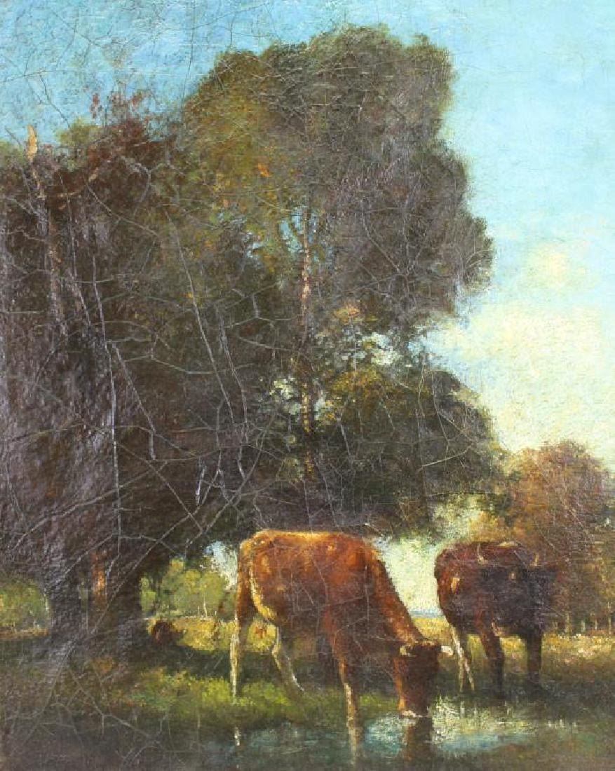 Bertus Pietersz (New Hampshire / Netherlands, 1869 - 1938) Oil on canvas painting of a bucolic landscape with cows drinking near a stream. Size: 20 x 16 inches.