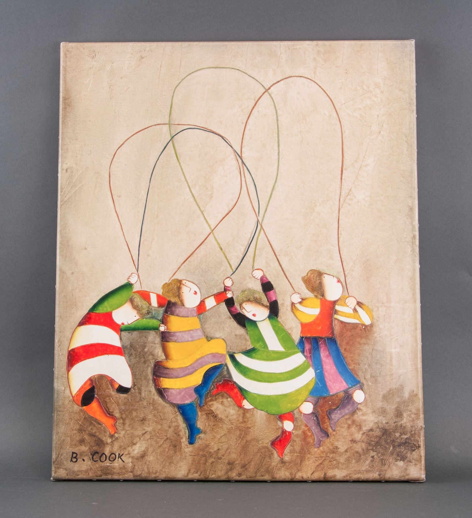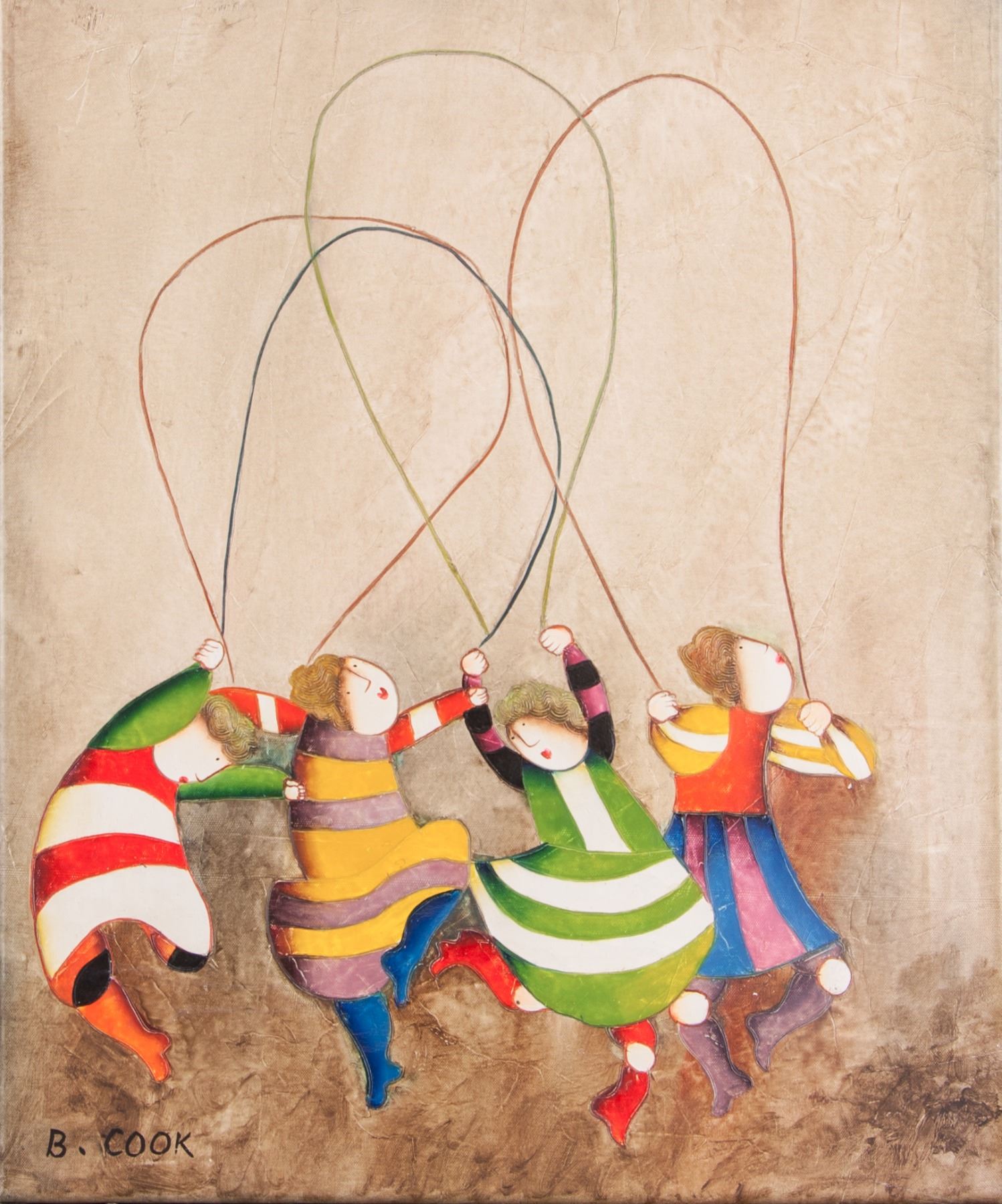 Painting of children jumping rope scene; oil on stretched canvas; signed Beryl Cook (1926-2008) on obverse and reverse, British artist; 23 inches x 19 inches