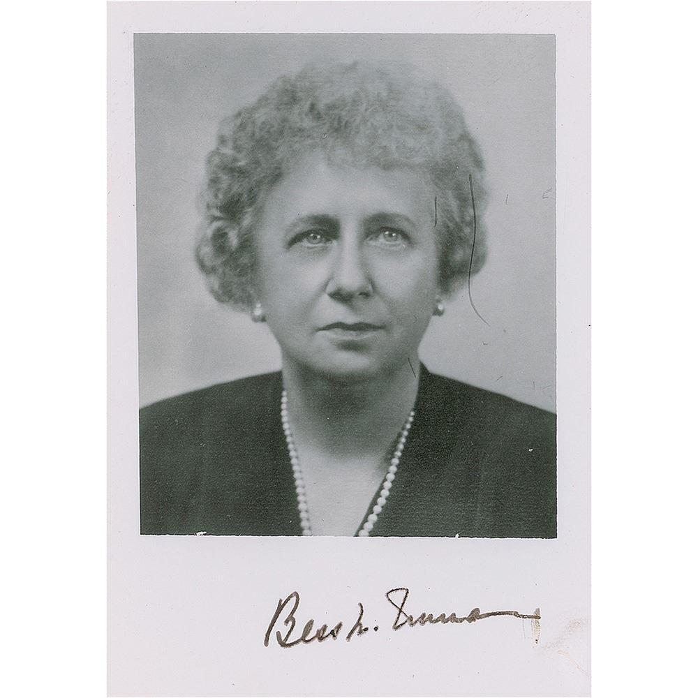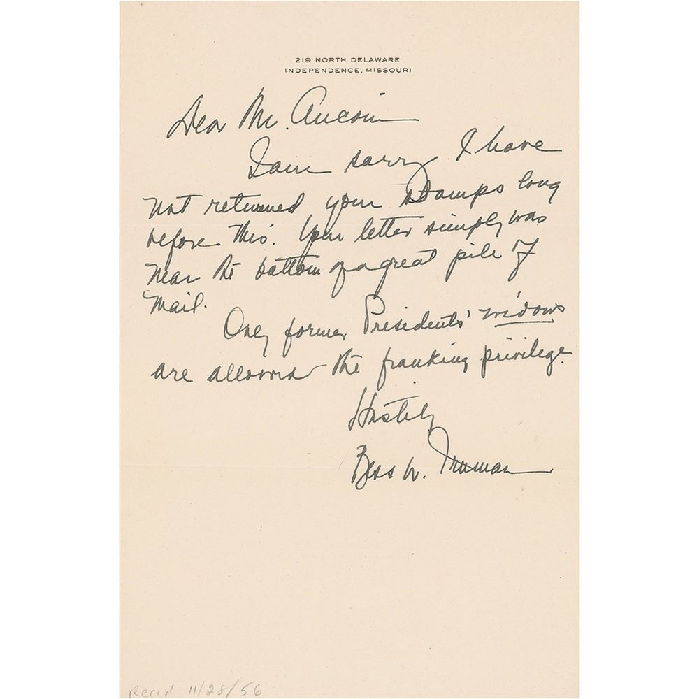 Two items: an ALS signed “Bess W. Truman,” one page, 6 x 9.25, no date [1956], personal letterhead, addressed to Lionel Aucoin of Spencer, Massachusetts, in full: “I am sorry I have not returned your stamps long before this. Your letter simply was near the bottom of a great pile of mail. Only former Presidents’ widows are allowed the franking privilege”; and a semi-glossy 3.5 x 5 photo, signed in the lower border in black ink, “Bess W. Truman.” In overall fine condition. Accompanied by the original mailing envelope, which bears a preprinted franking signature.