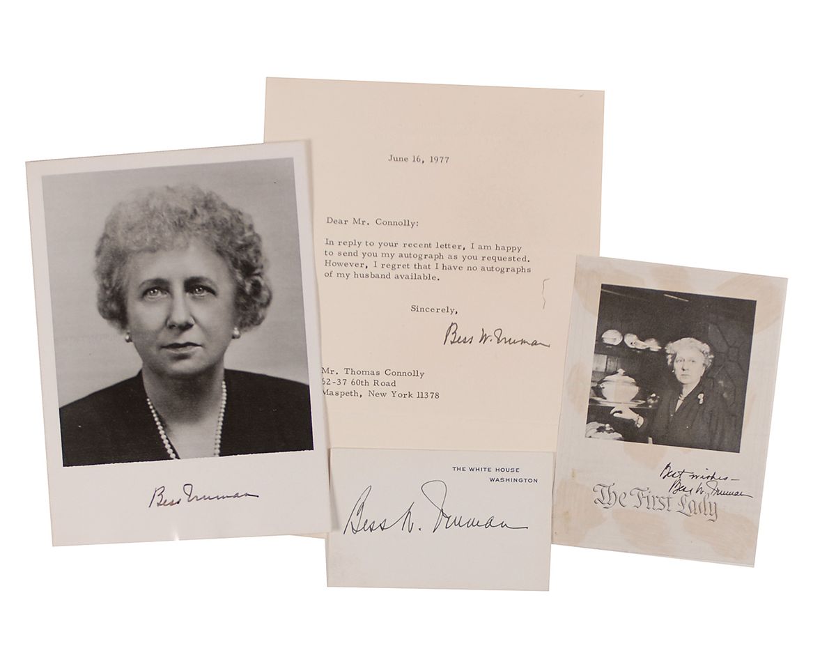 Four items: matte-finish 5 x 7 photo, signed in the lower border in black felt tip; White House card, signed in black ink, “Bess W. Truman”; a one page TLS from 1977, signed “Bess W. Truman,” complying with an autograph request; and a clipped 3.75 x 5 book photo, signed in black ink. Mild rippling to matte-finish photo, toning from adhesive on reverse of book photo, and toning and a stray mark to letter, otherwise fine condition.