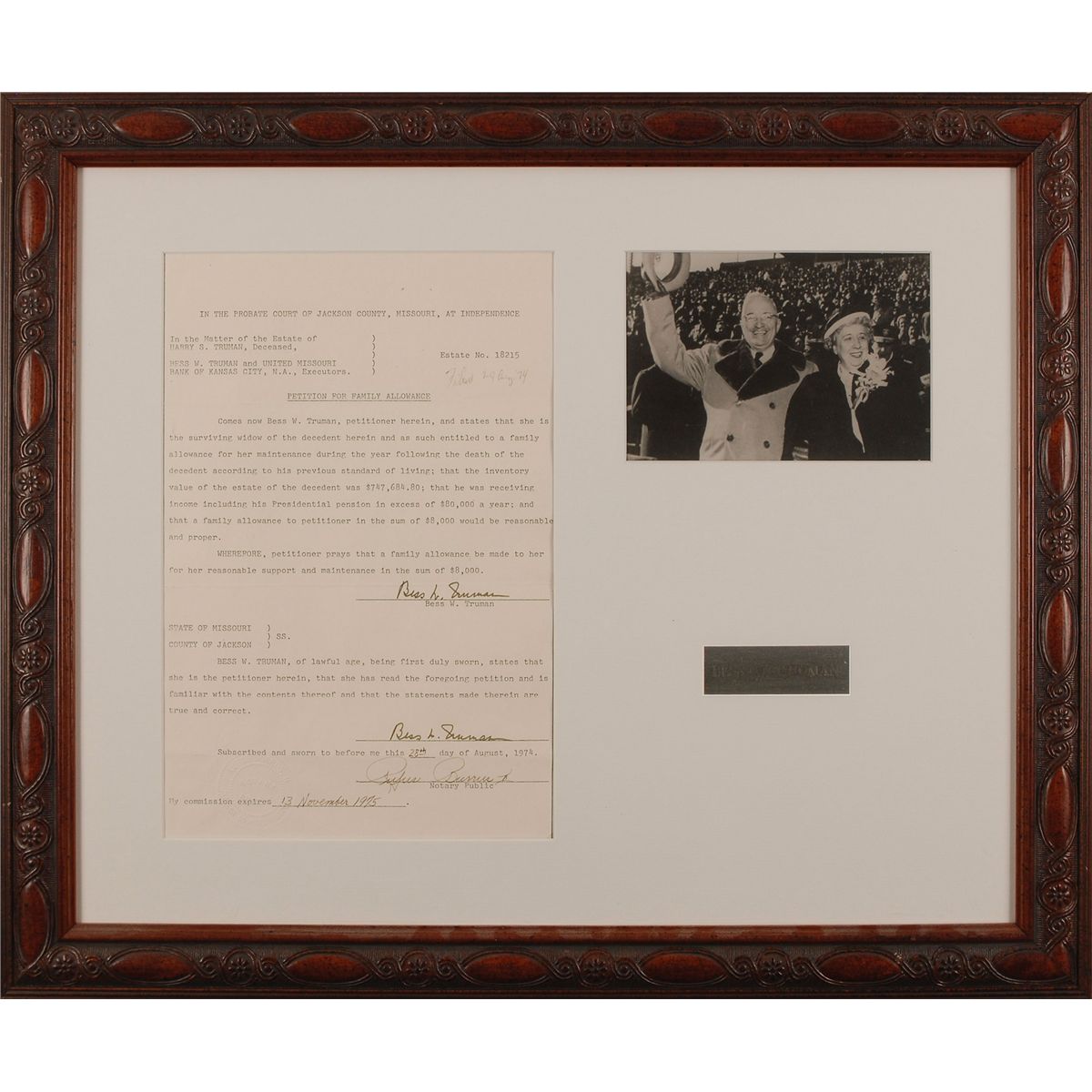 Notarized DS, signed “Bess W. Truman,” one page, 8 x 12, August 28, 1974. Petition for family allowance for Truman from her late husband’s estate. In part: “Comes now Bess W. Truman, petitioner herein…the surviving widow of the decedent herein and as such entitled to a family allowance for maintenance during the year following the death of the decedent according to his previous standard of living; that the inventory value of the estate of the decedent was $747,684.80; that he was receiving income including his Presidential pension in excess of $80,000 a year; and that a family allowance to petitioner in the sum of $8,000 would be reasonable and proper.” Signed twice at the conclusion by Truman. Matted and framed with a photo of the Trumans and a name plaque to an overall size of 22.25 x 18.5. In fine condition.
