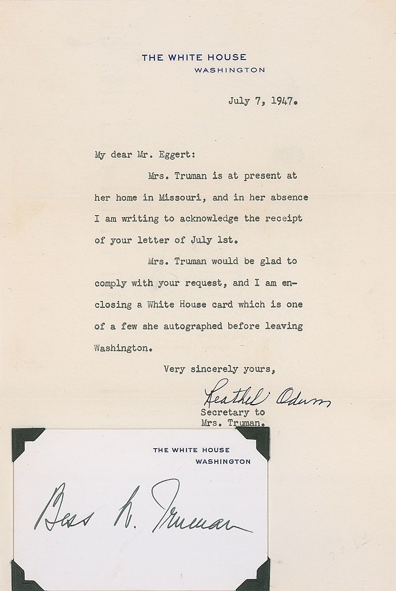 White House card, signed in fountain pen, “Bess W. Truman.” Corner-mounted to a TLS from her secretary on White House letterhead transmitting the card, dated July 7, 1947. In fine condition.
