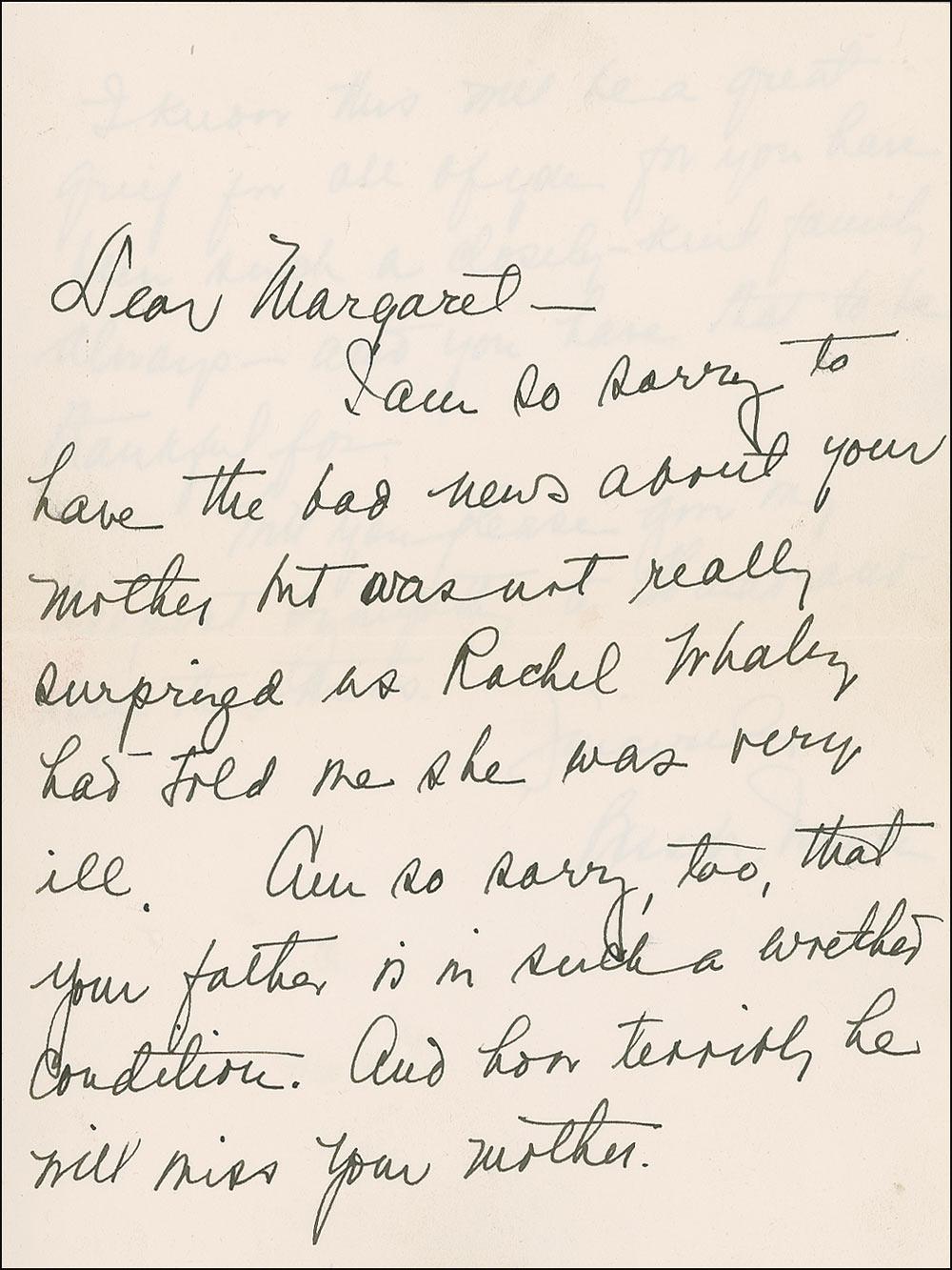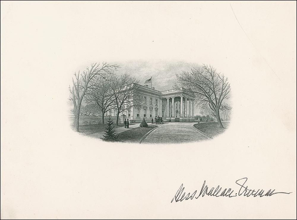 Two items: ALS, signed “Bess W. Truman,” two pages on two adjoined sheets, 6.25 x 8.25, no date, but postmarked February 7, 1951. Letter of condolence to Margaret Johnson. In part: “I am sorry to hear the bad news about your mother…Am so sorry, too, that your father is in such a wretched condition. And how terribly he will miss your mother.” Accompanied by the original mailing envelope, and an 8 x 6 engraved vignette of the White House, signed in black ink, “Bess Wallace Truman.” In fine condition.