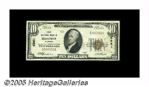 <B>Bessemer, AL</B></I> - $10 1929 Ty. 1 <B>First NB</B></I> Ch. # 6961<BR>A none-too-common Bessemer bank in small size, with hardly enough notes extant to satisfy the demand for them. Nice <B>Fine-Very Fine.</B></I>