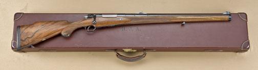 Best English quality bolt-action sporting rifle on prewar Mauser action by DWM. Signed Holland & Holland #33 Bruton, St. London. 22-1/2” barrel, fully stocked in Mannlicher style, select figured walnut stock, nicelycheckered, monte carlo cheek piece, mounted with European style sling swivels, finely engraved floorplate showing portrait of Cape Buffalo on center, engraved “4 Cartridges” on hinge, and hand engraved “3955C” ontriggerguard. The rifle shows flush gold inlays at the breech denoting caliber, “.375 H&H caliber rimless”. The rifle shows folding sights marked for 150, 100, and 50 yards and shows a folding cover for front sight. Thepistol grip cap is case hardened, nicely engraved with a trap and contains an extra front sight. The rifle is finely blued and shows a satin finish stock with leather covered English type recoil pad. Thebuttstock is inlaid in the owner’s plaque in the belly which is inlaid with the initials “RJA”. The rifle measures 44-1/8” overall, stock measures 14” from the trigger to the end of the wood. The condition is fine to