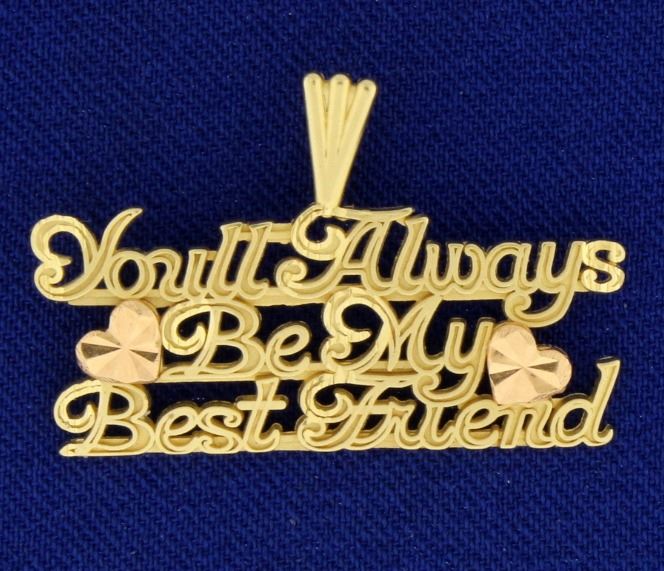 In 14k yellow and rose gold, says "You'll Always Be My Best Friend". 3/4 inches long with bale and 1 1/4 inches wide. 2.3g.