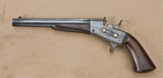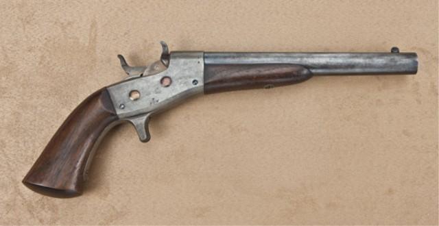 Best Known model 1866 Remington Rolling Block Navy, navy marked, blue and case hardened finish, cartouche wood grips, serial #2443. The barrel shows 20-40% original blue, evenly drifting and toning at the edges, some light erosion and normal aging just starting. The frame shows 30-50% case hardening drifting to grey with some good colors lightly showing. The small parts show bright original straw blue. The stocks are very good plus to near fine with crisp edges, sharp cartouche on left bottom grips, with “HW” razor sharp. Stocks show some small marks, particularly in the forend from military storage. The action is crisp, the bore excellent. Provenance Richard Littlefield and Jerry Landskron collection. Est: $4,000 - $8,00
