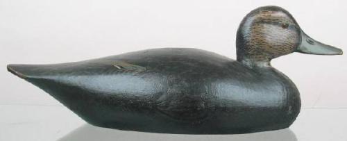 Best style turned head working black duck by A. E. Crowell, East Harwich, MA. with an oval hot brand on the bottom. In XOP with delicate feathering. Struck by a few shot, an in the making addition of a piece of wood to the left side of the body. Surface has a coat of protective finish feeder. (decoy)