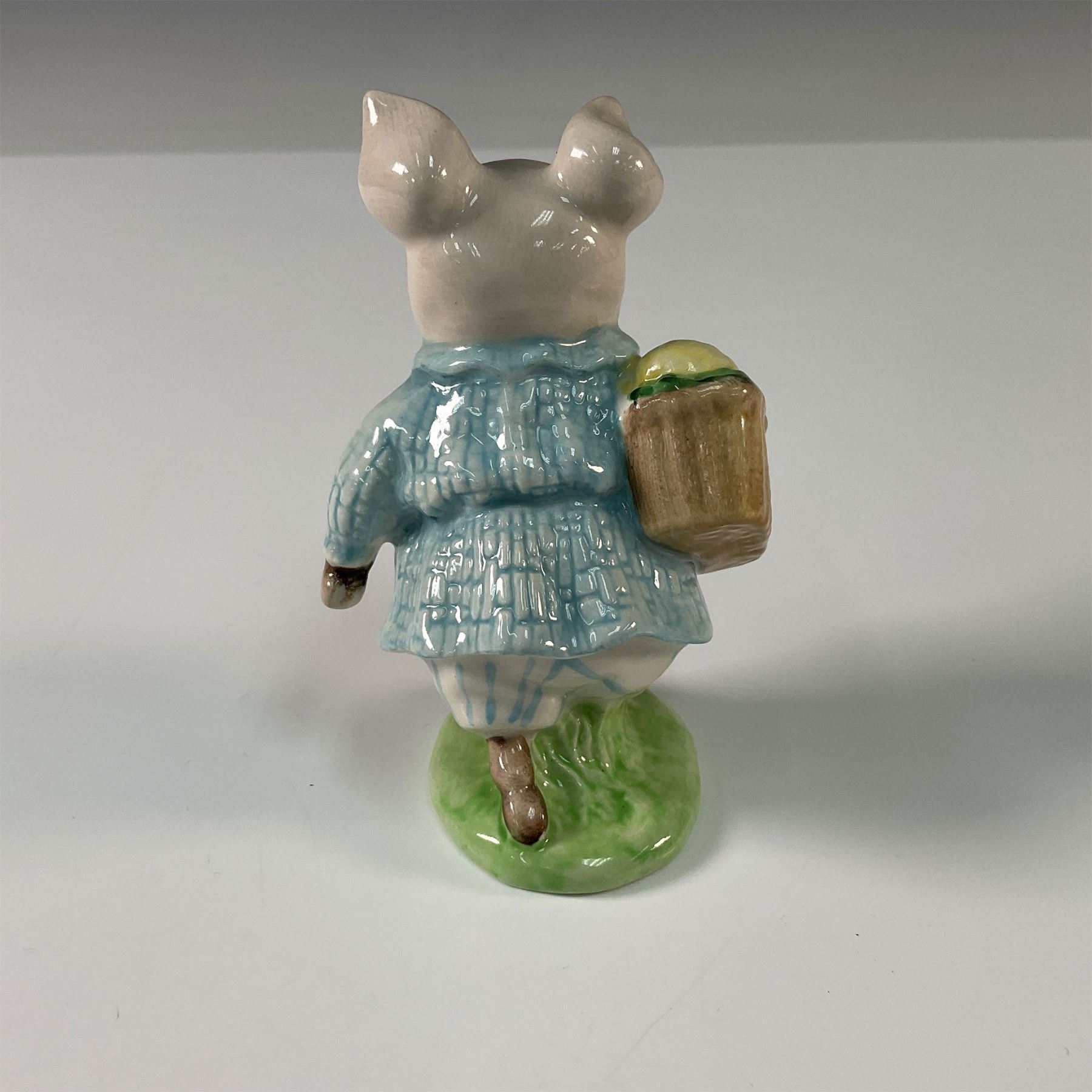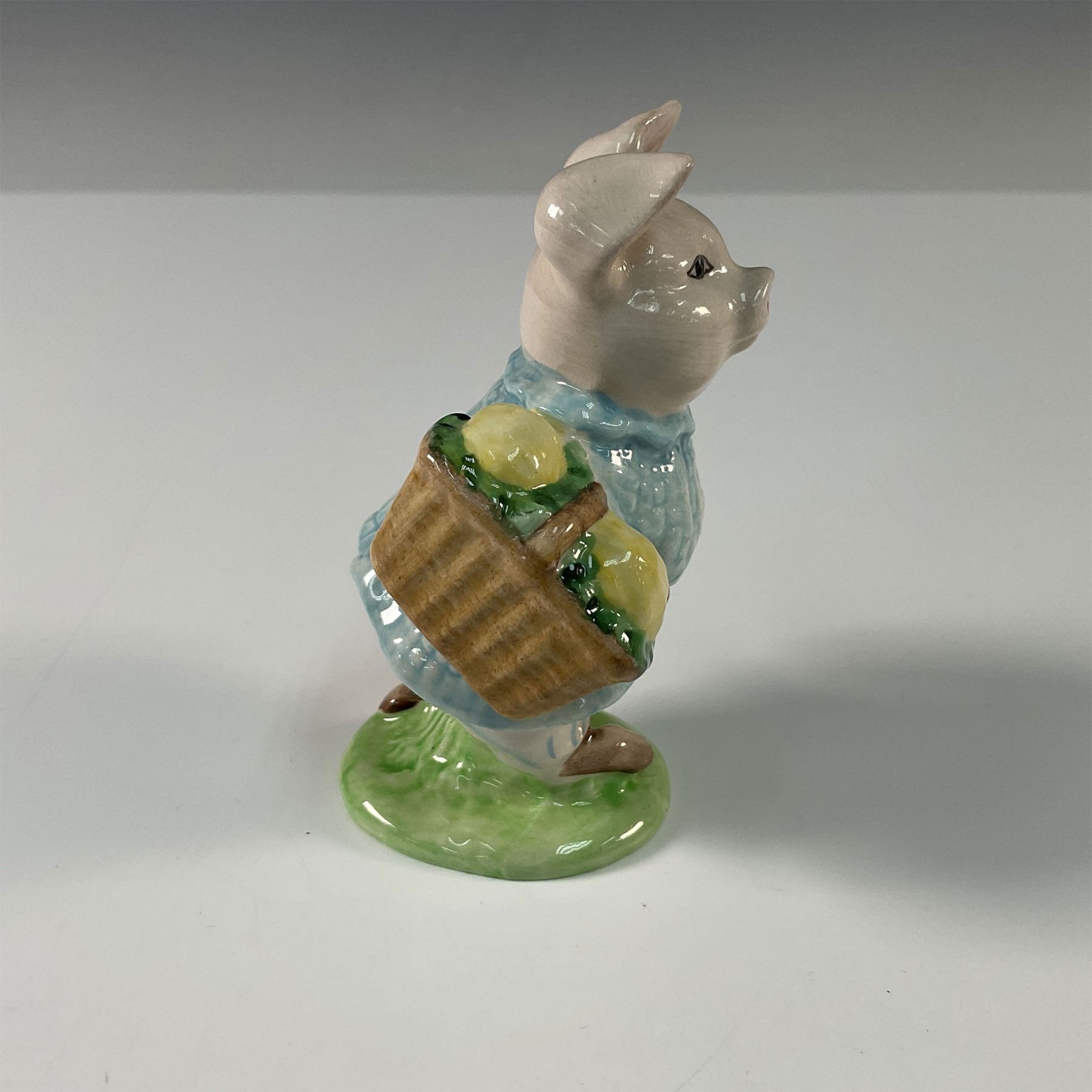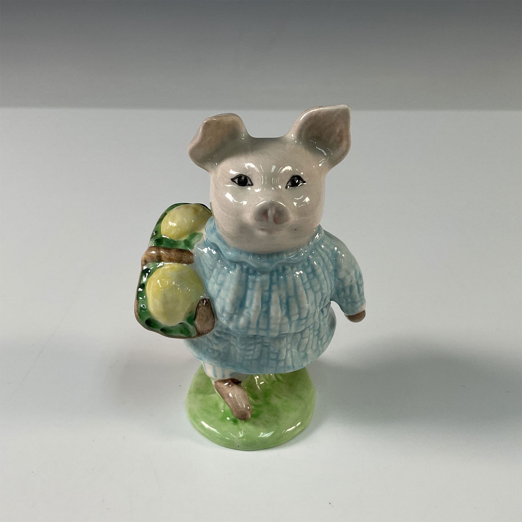 Charming Beswick figurine featuring Beatrix Potter's Little Pig Robinson. Crafted in fine earthenware, this delightful figure portrays the character in a blue smock, carrying a basket of apples. Designed with exquisite hand painted details. Beswick backstamp.
