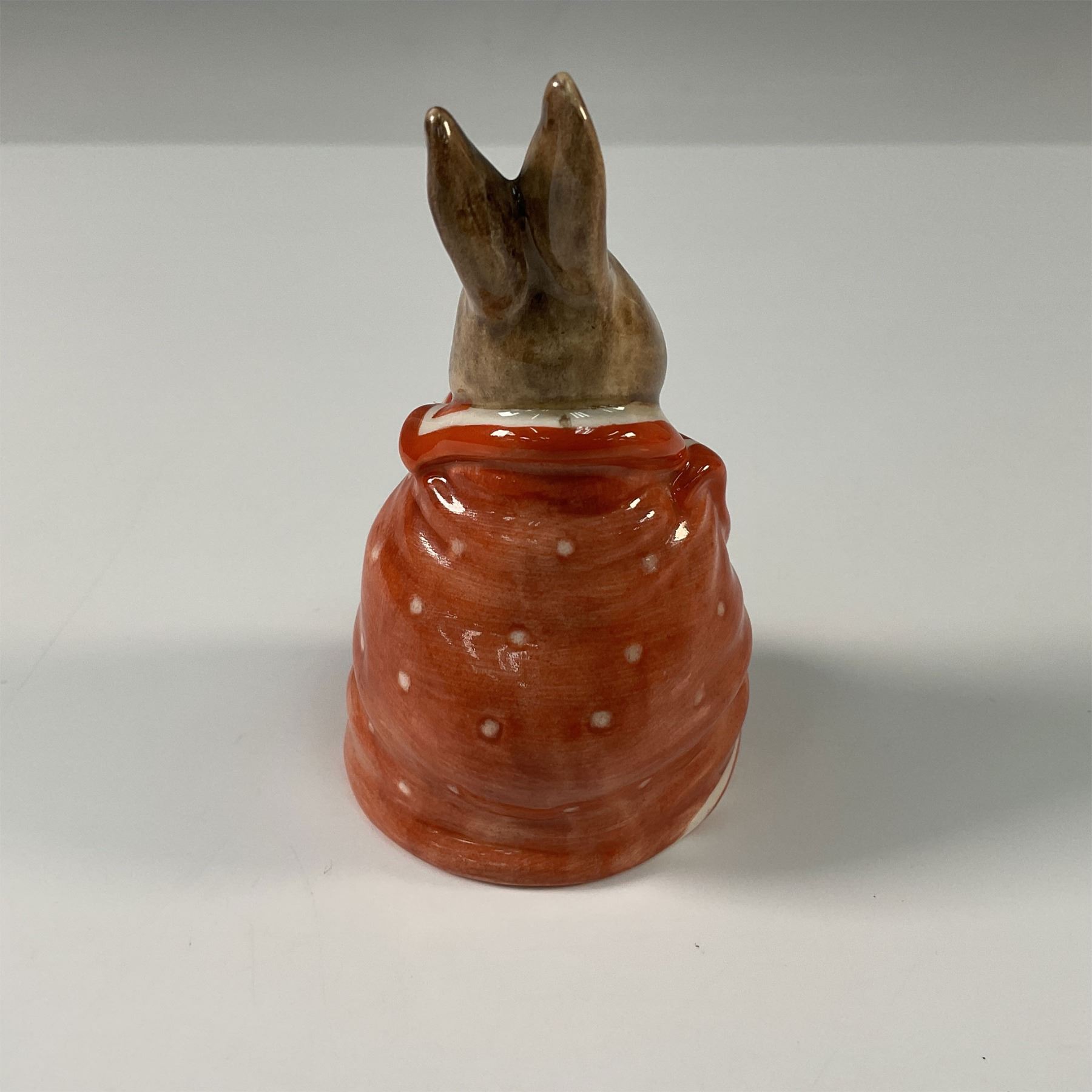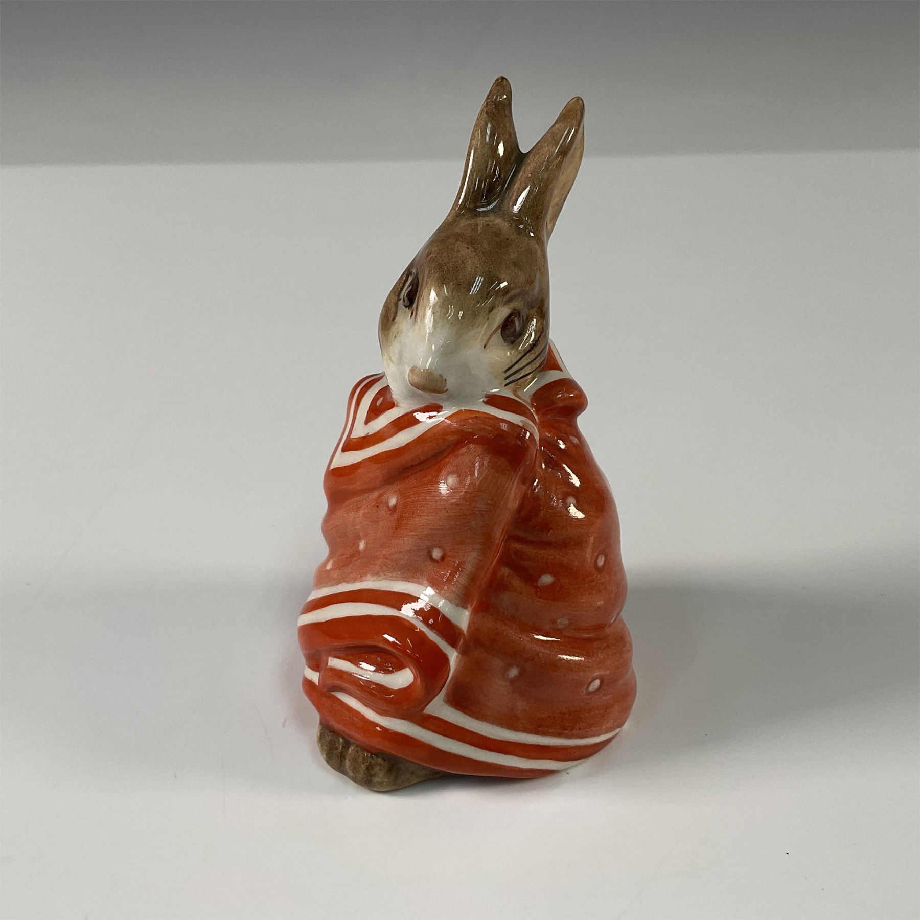A charming Beswick porcelain figurine depicting Poorly Peter Rabbit from Beatrix Potter's beloved tales. Designed with exquisite detail, this collectible portrays Peter Rabbit wrapped in a red polka dotted shawl, evoking the warmth and whimsy of the classic story. Beswick backstamp.