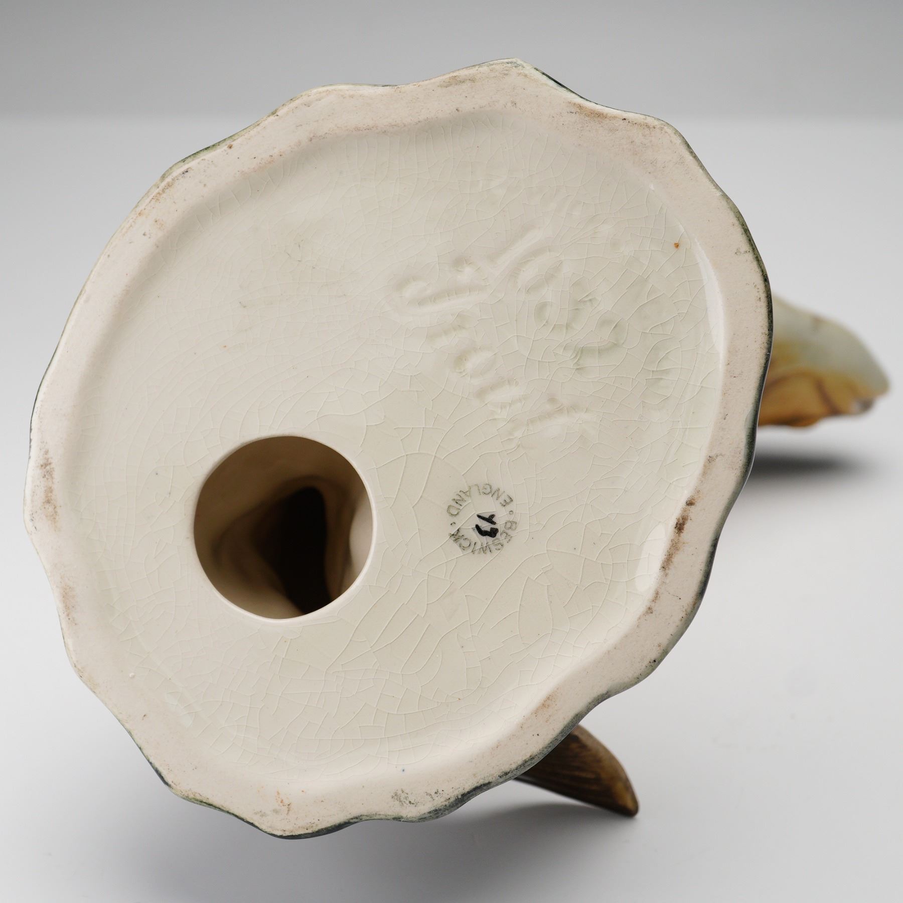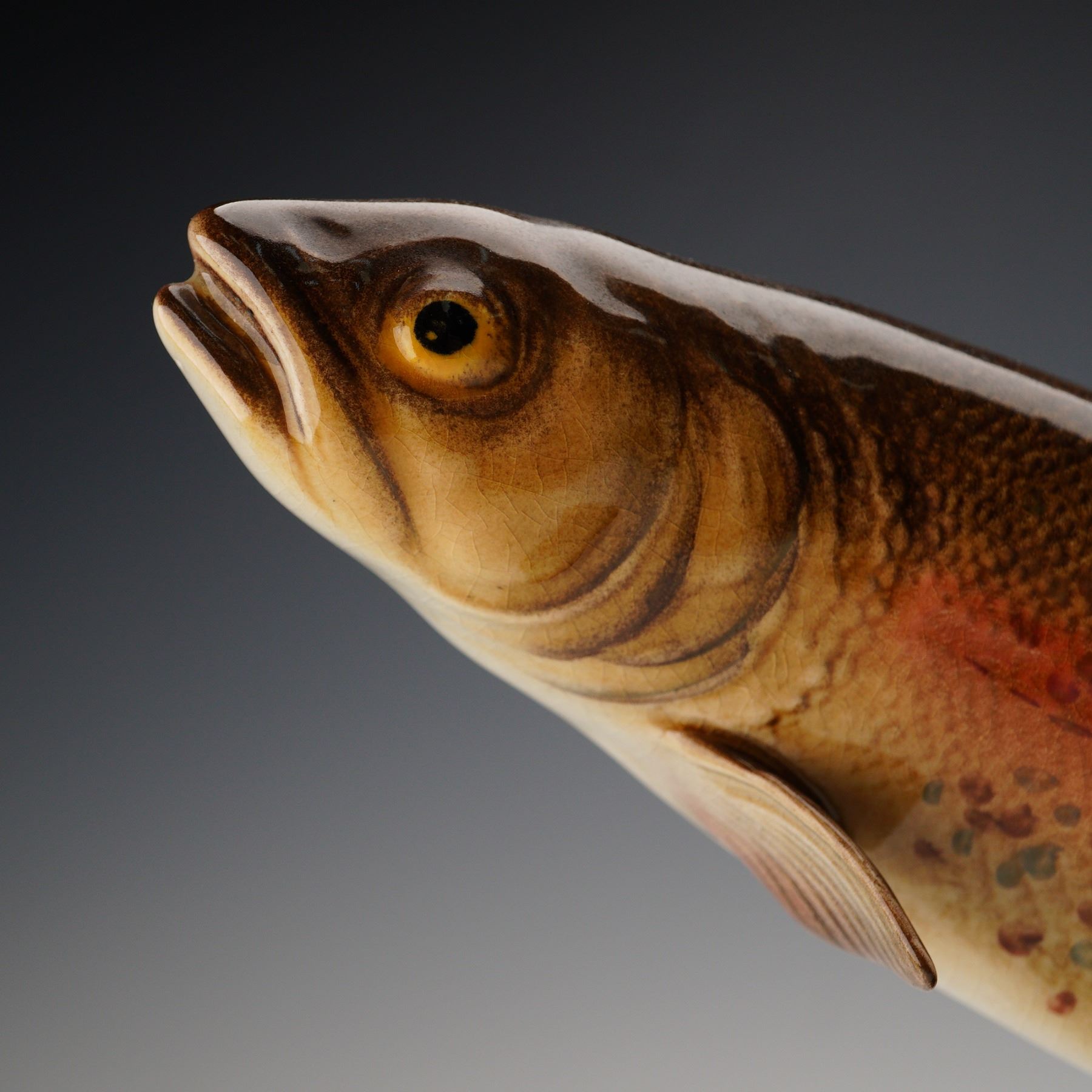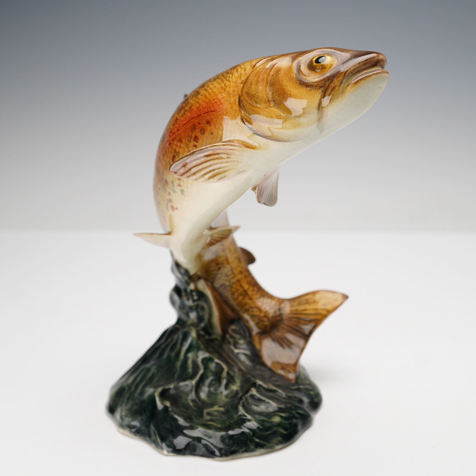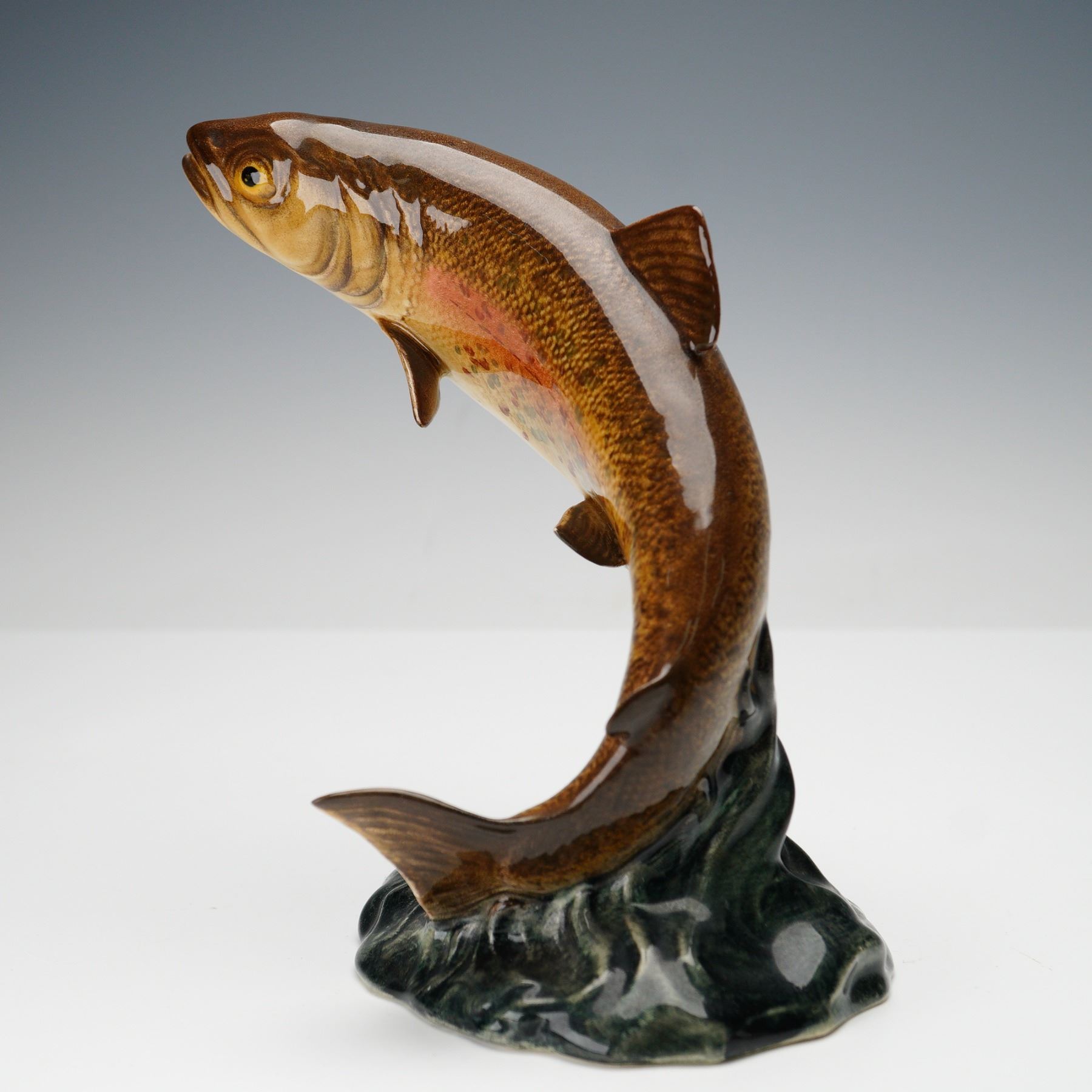 An English ceramic figure, model no. 1032, depicting a trout leaping from a watery textured base. The body of the fish is finished in a high-gloss glaze, exhibiting a graduated coloration of rich brown. "1032" and "Trout" impressed to the underside. Beswick backstamp.