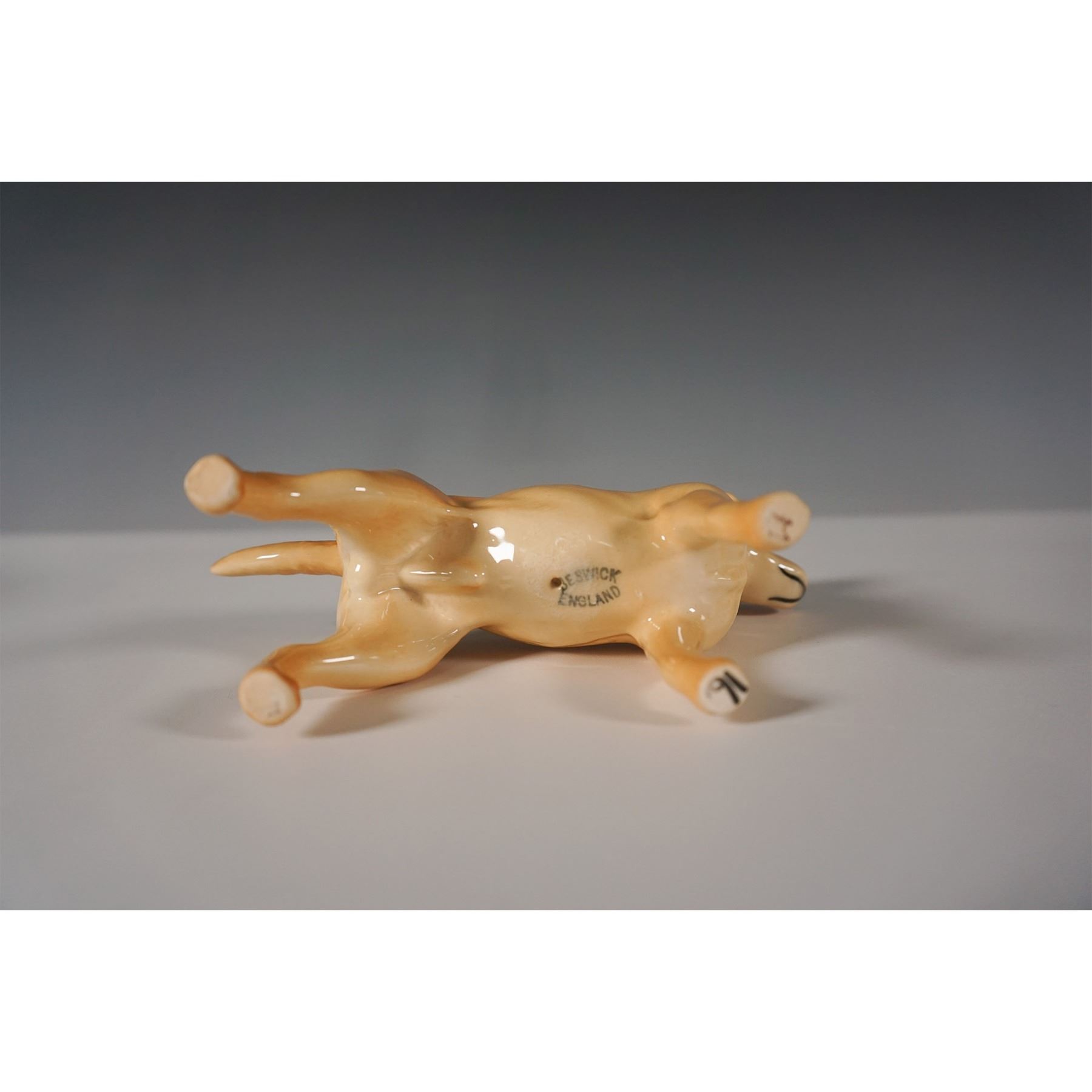 A finely crafted Beswick porcelain figurine depicting a Labrador Retriever in a standing pose. Finished in a warm honey-colored glaze, this piece showcases the brand’s signature high-gloss finish, highlighting the detailed sculpting and lifelike expression of the breed. The underside bears the Beswick England backstamp, verifying its authenticity. This collectible figurine is an excellent addition for Beswick enthusiasts and dog lovers alike. This item has its original box.