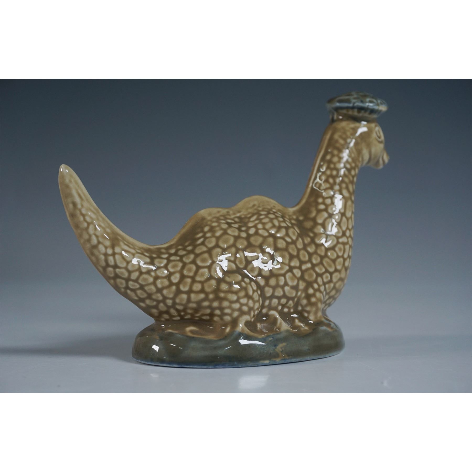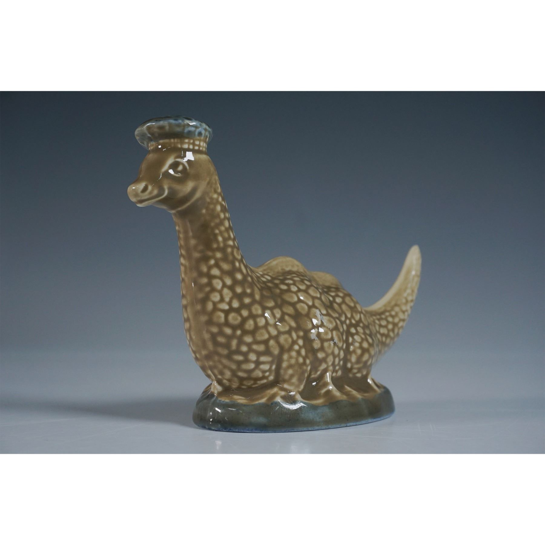 A charming Beswick ceramic decanter in the form of the Loch Ness Monster, designed to contain Beneagles Scotch Whisky. Modeled by A. Holland in 1969, this whimsical piece features a textured brown body with a blue beret. Marked on the underside with "Beswick England," the model number 1969, and detailed text referencing the product. Measures 3.5"H. A collectible piece for whisky and Beswick enthusiasts alike.