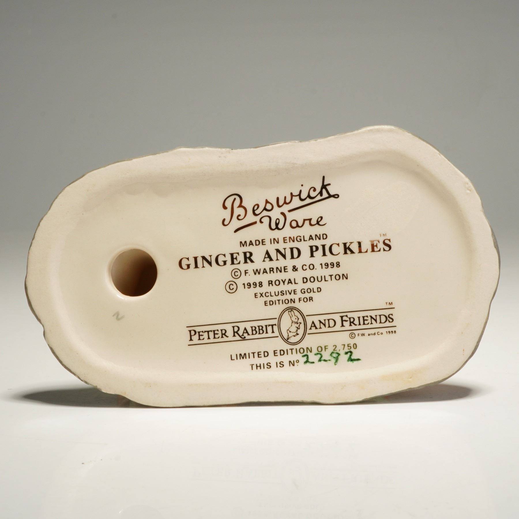 A Beswick Ware ceramic tableau titled Ginger and Pickles, produced as part of the Peter Rabbit and Friends collection. The piece depicts two anthropomorphic characters from Beatrix Potter's literature: Ginger, an orange tabby cat in a mint green coat and white apron holding a money bag with gold-toned detailing, and Pickles, a black and white dog in a tan coat and white apron holding an orange ledger. The figures are set upon a base molded to resemble grey cobblestones. The underside is marked with the Beswick Ware and Royal Doulton logos, dated 1998, and identifies the piece as an Exclusive Gold Edition. It is hand-numbered 2292 from a limited edition of 2,750.