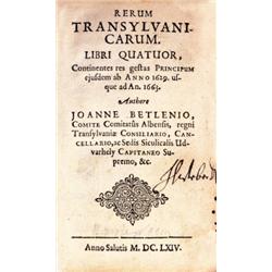 Bet[h]len [János], Joanne[s]: Rerum Transylvanicarum. Libri quatuor, continentes res gestas principum ejusdem ab Anno 1629. usque ad An. 1663.<p>A history of Transylvania from 1629 to 1663. In modern vellum.